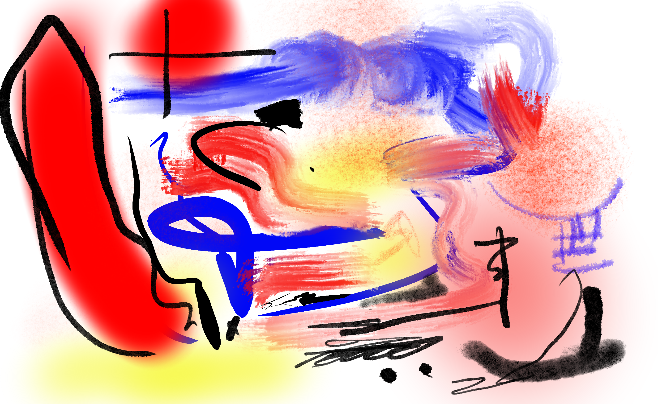 Dieses lebendige, abstrakte Werk vereint Bewegung und Symbolik in einer ausdrucksstarken Farbexplosion. Rote, blaue und gelbe Flächen strahlen wie Emotionen auf der Leinwand, durchzogen von schwarzen, kalligrafieartigen Linien, die wie Gedanken oder Zeichen anmuten. Die Farbverläufe erinnern an Morgendämmerung und innere Feuer – eine energetische Komposition, die gleichzeitig offen und geheimnisvoll wirkt.