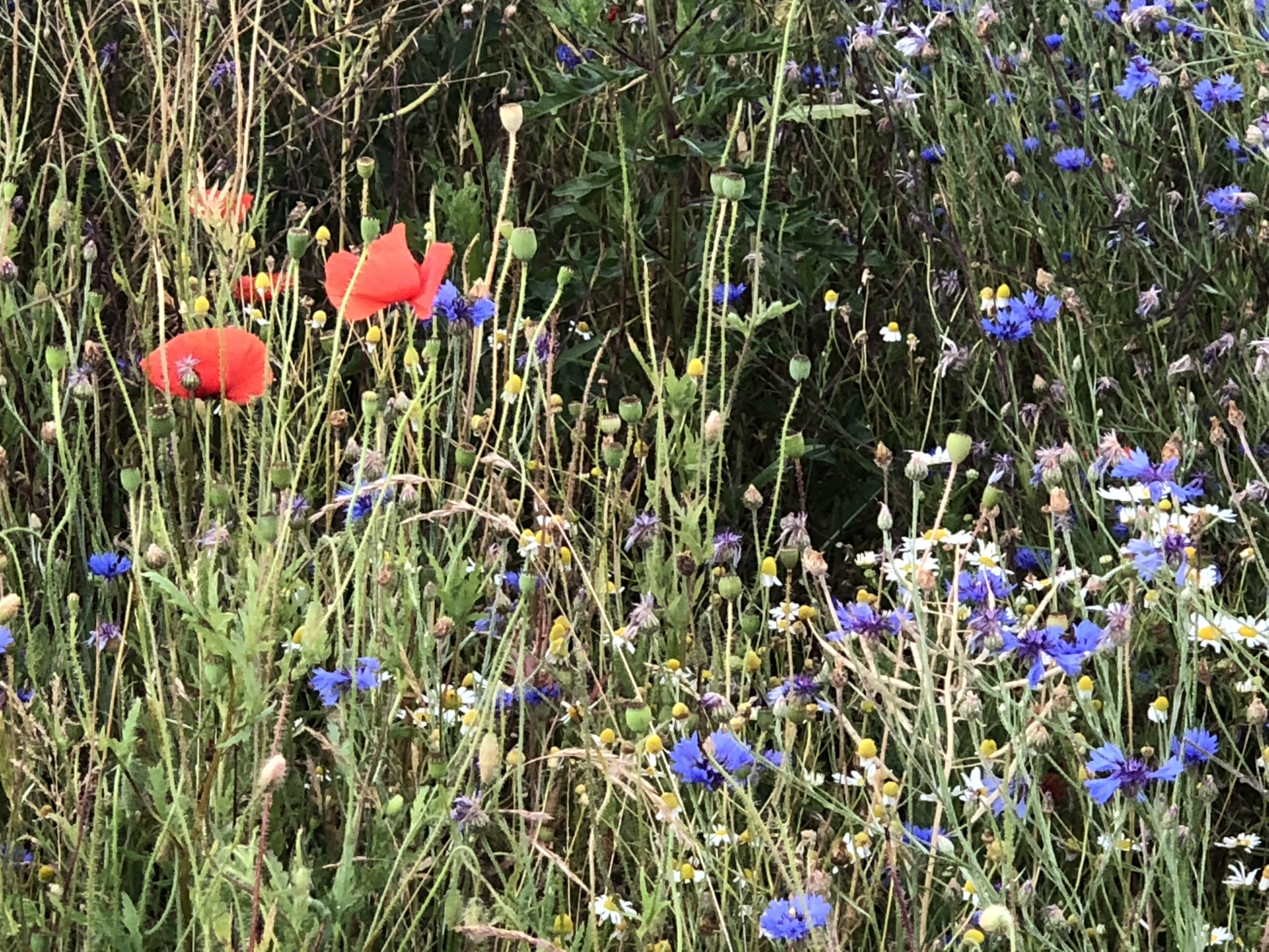 Das Bild zeigt eine blühende Wiese mit verschiedenen Wildblumen. Auffällig sind die leuchtend roten Mohnblüten, die im Vordergrund hervorsticht. Um sie herum wachsen zahlreiche blaue Kornblumen sowie weiße Kamillenblüten und andere grüne Pflanzen. Die Szene vermittelt ein natürliches und ungezähmtes Gefühl, mit einer Vielzahl von Farben und Formen, die harmonisch zusammenwirken. Die hohe, trockene Grasstruktur umrahmt die bunten Blumen und trägt zur rustikalen Atmosphäre bei.