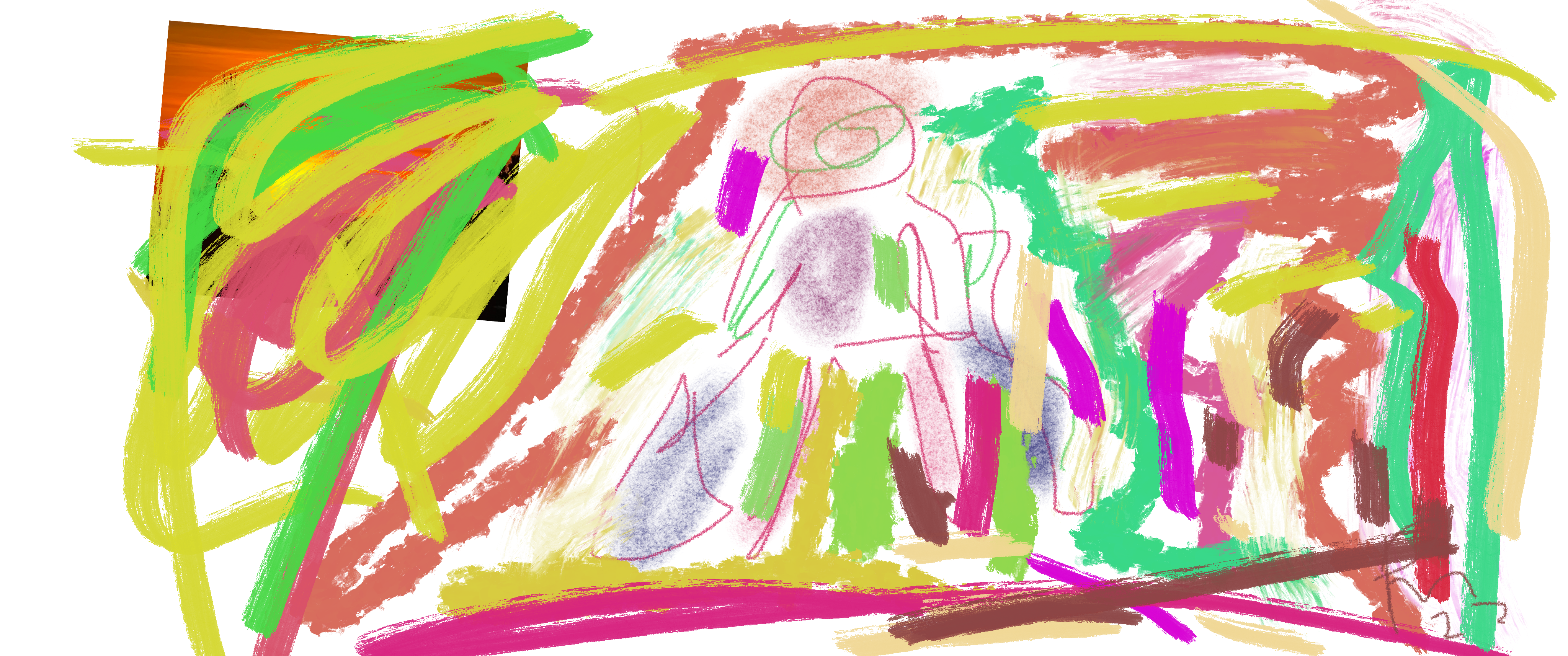 Verspielt, wild und tief emotional – dieses Werk erinnert an die Ausdruckskraft kindlicher Fantasie. Inmitten eines chaotischen Farbsturms erkennt man die zarte, fast schemenhafte Figur eines Menschen, eingerahmt von leuchtendem Gelb, Pink, Grün und Braun. Die Linien wirken spontan und intuitiv, als sei das Bild in einem Moment voller Energie und Freiheit entstanden. Das Werk erzählt von Unschuld, innerer Unruhe und der Suche nach Orientierung im Wirbel des Lebens.