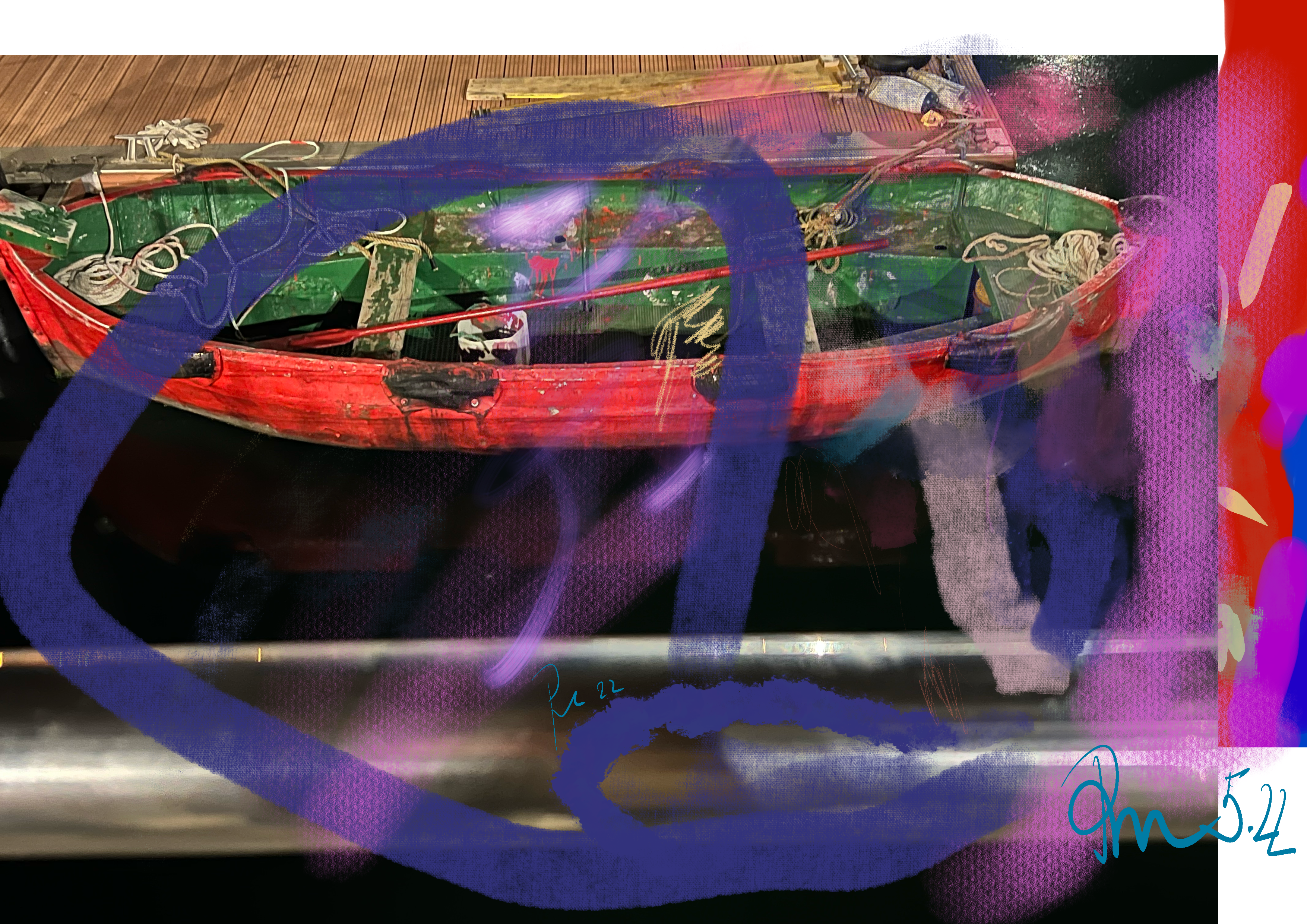 Ein altes Fischerboot in kräftigem Rot-Grün liegt ruhig am Steg – doch das Bild selbst ist alles andere als still. Dynamische Farbverläufe in Lila, Pink und Blau umspielen das Boot wie ein lebendiger Fluss aus Emotion und Fantasie. Die digitale Übermalung transformiert die Fotografie in ein poetisches Kunstwerk, in dem Realität und Abstraktion miteinander verschmelzen. Das Werk erzählt von Reise, Erinnerung, und den Spuren, die das Leben hinterlässt – auf Holz, Wasser und Seele.