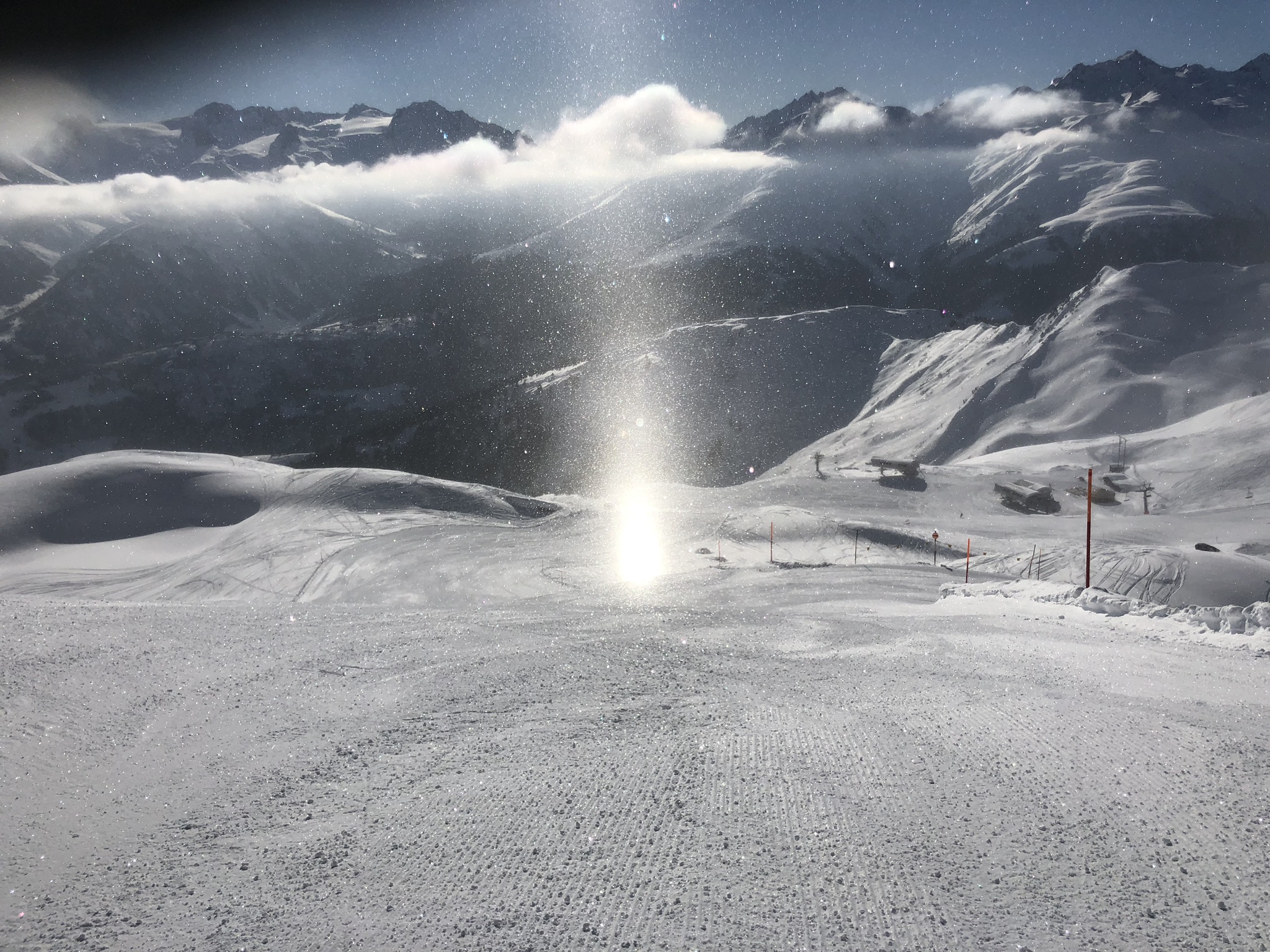 Genießen Sie die atemberaubende Aussicht auf eine schneebedeckte Berglandschaft, die von strahlendem Sonnenlicht erleuchtet wird. Die unberührte Piste, die sanft ins Tal führt, ist von einem glitzernden Schneeteppich bedeckt. In der Ferne sind majestätische Berge mit schneebedeckten Gipfeln und einem leichten Wolkenteppich zu sehen. Das Bild vermittelt ein Gefühl von Ruhe und Abenteuer, ideal für Wintersportliebhaber, die die Schönheit der Natur erleben möchten. Verpassen Sie nicht die Möglichkeit, in dieser traumhaften Kulisse aktiv zu werden und unvergessliche Momente im Schnee zu verbringen.