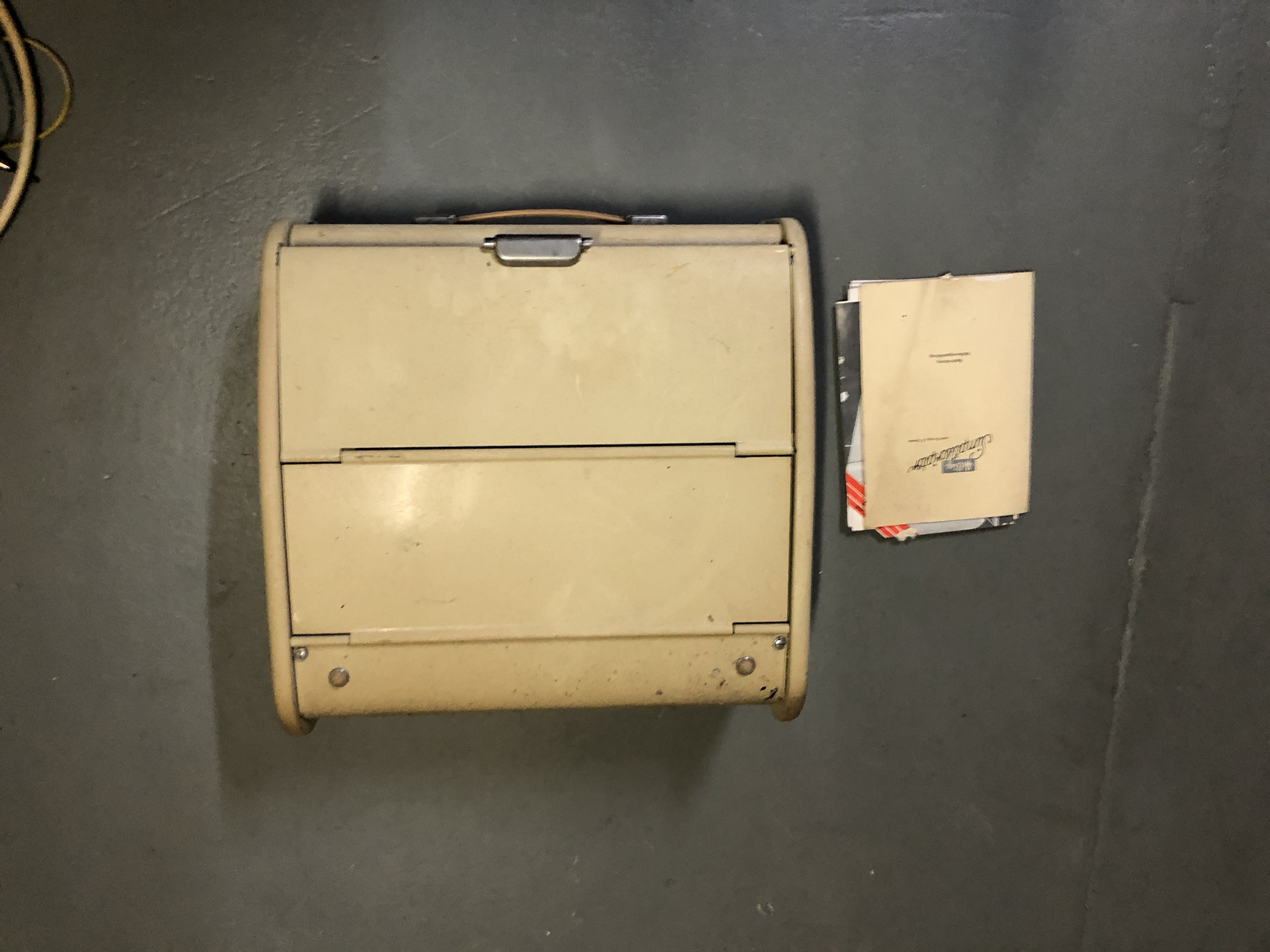 Zu sehen ist ein älterer, grauer Koffer mit einem abgerundeten Design. Der Koffer ist geschlossen und hat eine Schnalle in der Mitte sowie einen Traggriff an der Oberseite. Neben dem Koffer liegt ein Stapel gefalteter Blätter, die unterschiedliche Dokumente enthalten. Die Blätter wirken etwas abgenutzt und zeigen eine Mischung aus Text und Diagrammen. Der Untergrund ist einfarbig und scheint aus Beton oder einem ähnlichen Material zu bestehen.
