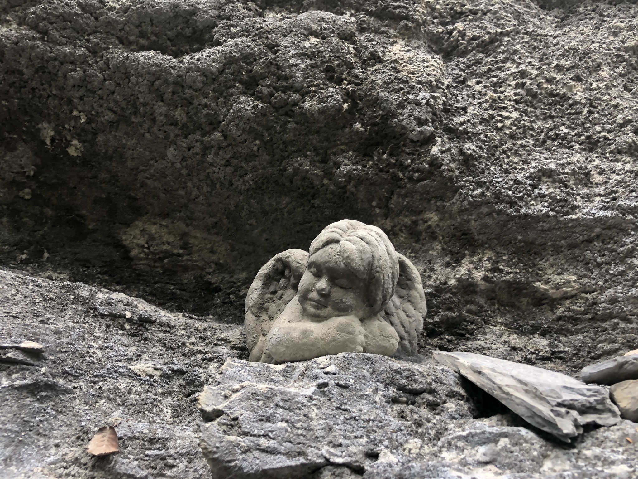 Auf dem Bild ist eine kleine Statue eines Engels zu sehen, die auf einer grauen, steinigen Oberfläche platziert ist. Der Engel hat geschlossene Augen und eine friedliche Miene, während er seine kleinen Flügel angelegt hat. Die Statue ist aus einem helleren Material gefertigt, das sich von dem dunklen, rauen Untergrund abhebt. Rund um die Statue liegen einige flache Steine und kleine Blätter, die dem Bild eine natürliche und rustikale Atmosphäre verleihen. Der Hintergrund ist von grobem, strukturierter Fels geschlossen, der die Szene ergänzt.