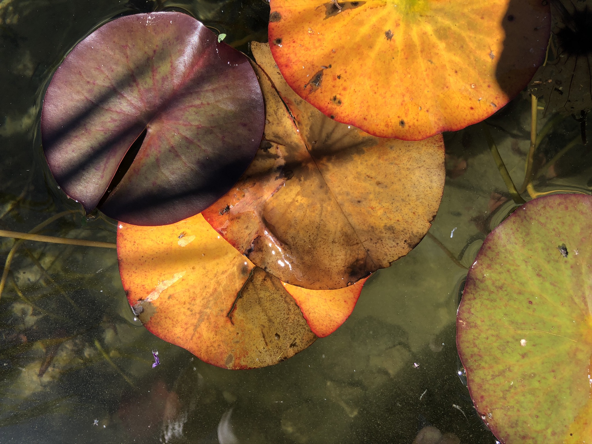 Auf dem Bild sind mehrere Seerosenblätter zu sehen, die auf der Wasseroberfläche schwimmen. Die Blätter haben unterschiedliche Farben, darunter tiefrot, orange und grün mit einem leicht strukturierten Aussehen. Einige Blätter sind beschädigt und weisen kleine Flecken auf. Die Wasseroberfläche ist klar, und es sind einige Wasserpflanzen und Reflexionen sichtbar. Die Lichtverhältnisse deuten auf einen sonnigen Tag hin, was die Farben der Blätter lebhaft erscheinen lässt.