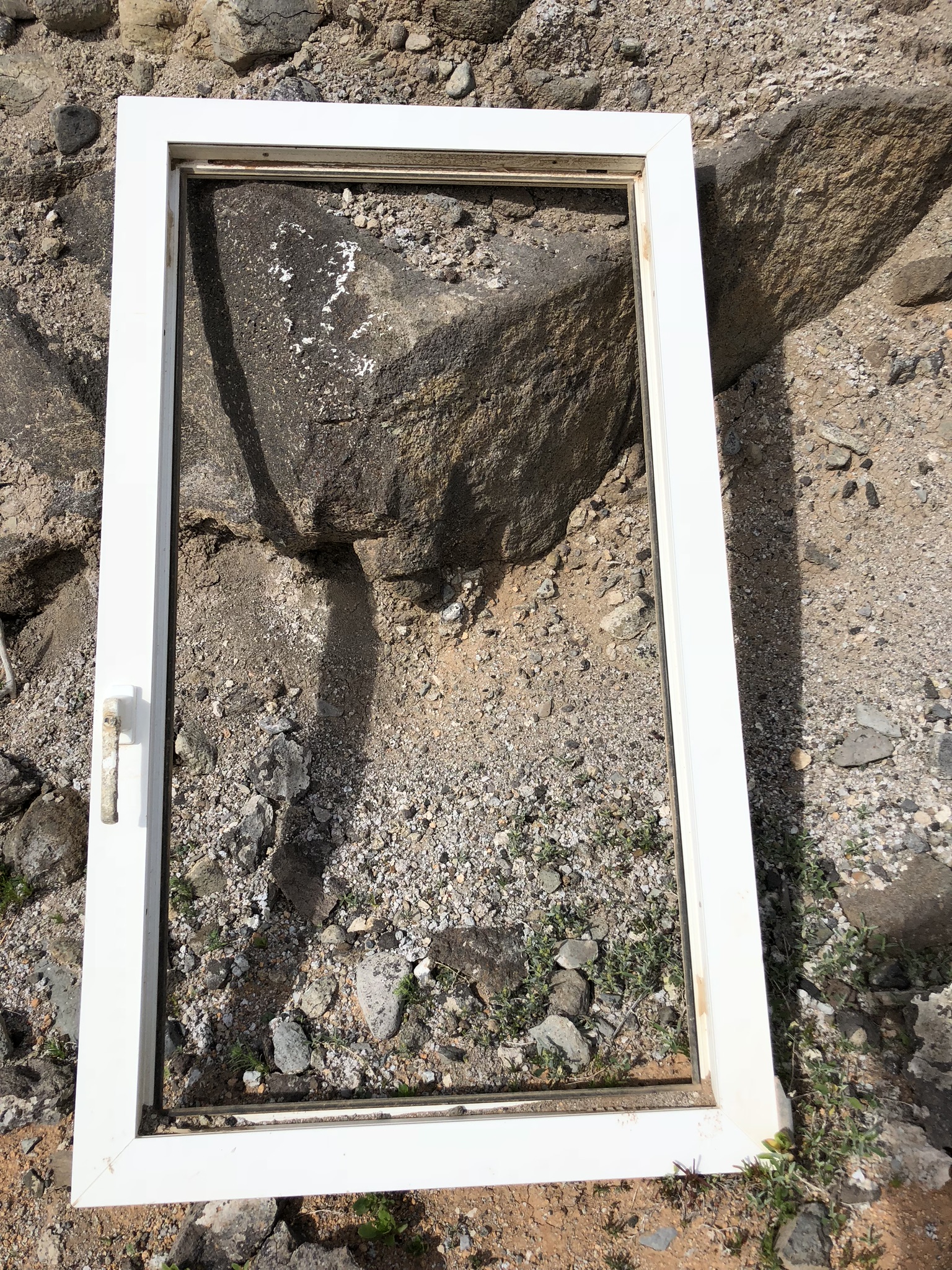 Weiße Fensterrahmen für den Außenbereich. Der Rahmen ist aus robustem Material gefertigt und weist einige Gebrauchsspuren auf. Er liegt auf einem felsigen Untergrund und umgeben von Kies und kleinen Pflanzen. Der Rahmen ist unglasiert und hat eine gräuliche Dichtungsmasse im Inneren. Die Griffleiste ist an der linken Seite sichtbar und etwas abgenutzt. Ideal für DIY-Projekte oder als Dekorationselement im Garten.