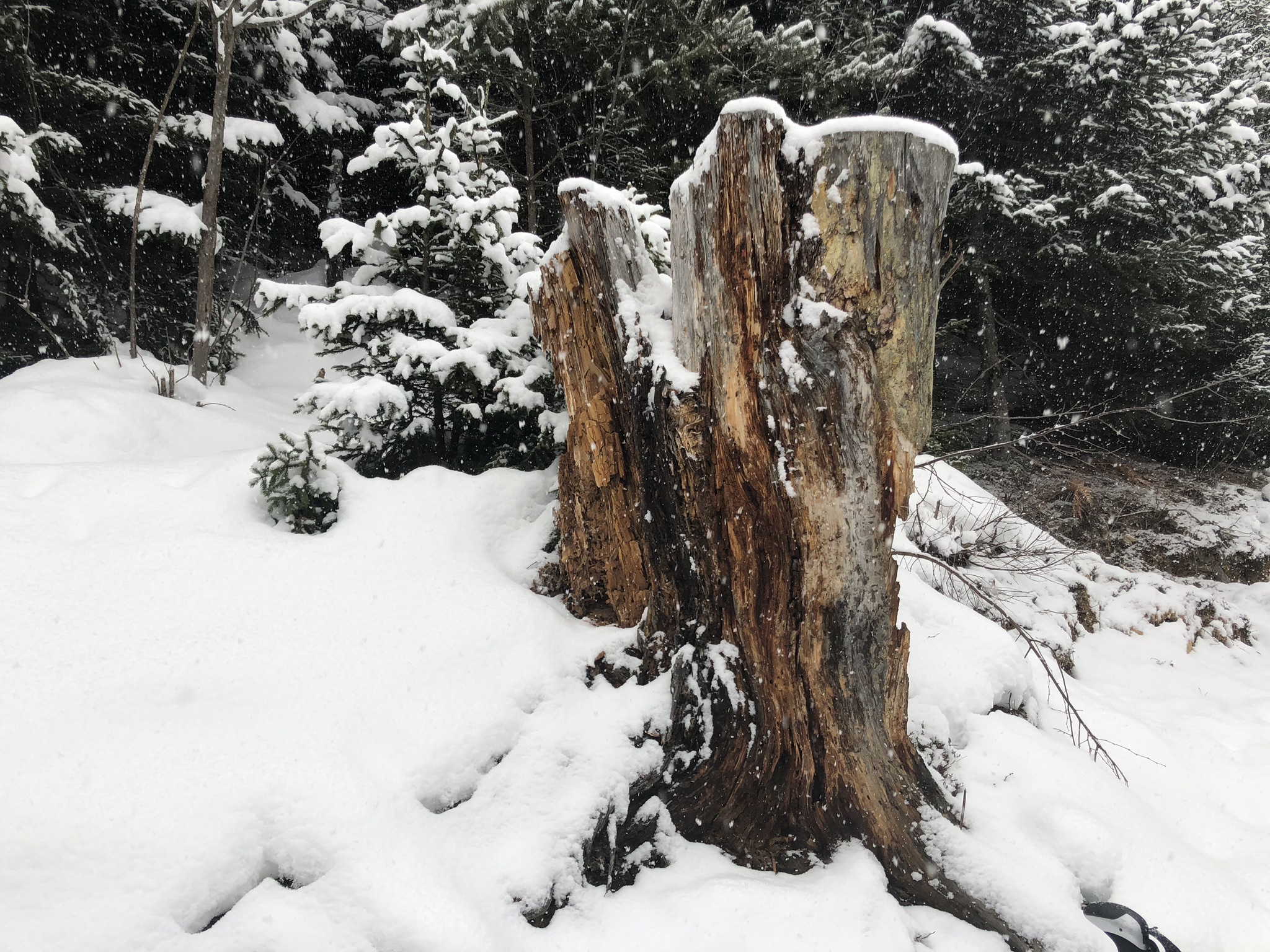 Ein verwitterter Baumstumpf steht in einer verschneiten Landschaft. Der Stamm ist grob und zeigt eine raue, strukturierte Oberfläche, die von der Zeit und den Elementen gezeichnet ist. Um den Baumstumpf herum liegt eine dicke Schicht frischen, weißen Schnees, während einzelne, kleine Nadelbäume im Hintergrund sichtbar sind. Die Szenerie ist von sanften, aber intensiven Schneeflocken geprägt, die leise vom Himmel fallen und eine ruhige, friedliche Winteratmosphäre schaffen.