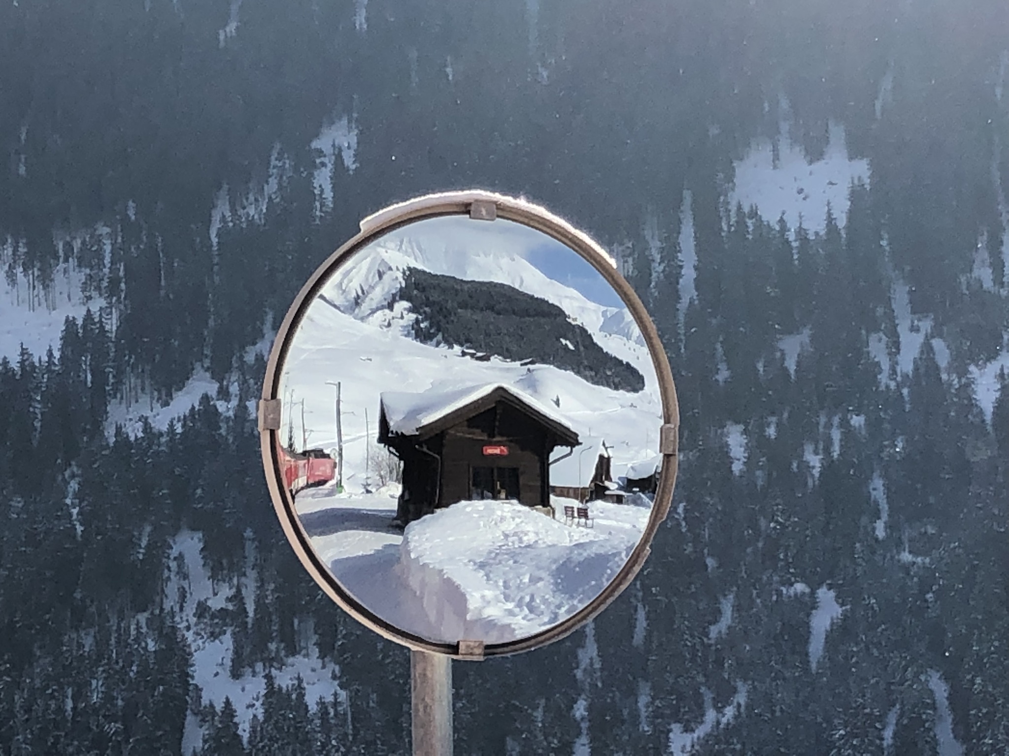 Auf dem Bild ist ein runder Spiegel zu sehen, der eine winterliche Landschaft reflektiert. Der Hintergrund zeigt schneebedeckte Berge und grüne Tannenwälder. Im Spiegel ist ein Holzhaus sichtbar, das mit Schnee bedeckt ist, sowie der Weg, der zum Haus führt. Eine rote Bahnlinie kann auf der linken Seite im Spiegel erkannt werden. Die Szenerie ist hell und sonnig, mit klaren blauen Himmel und schneebedeckten Flächen.