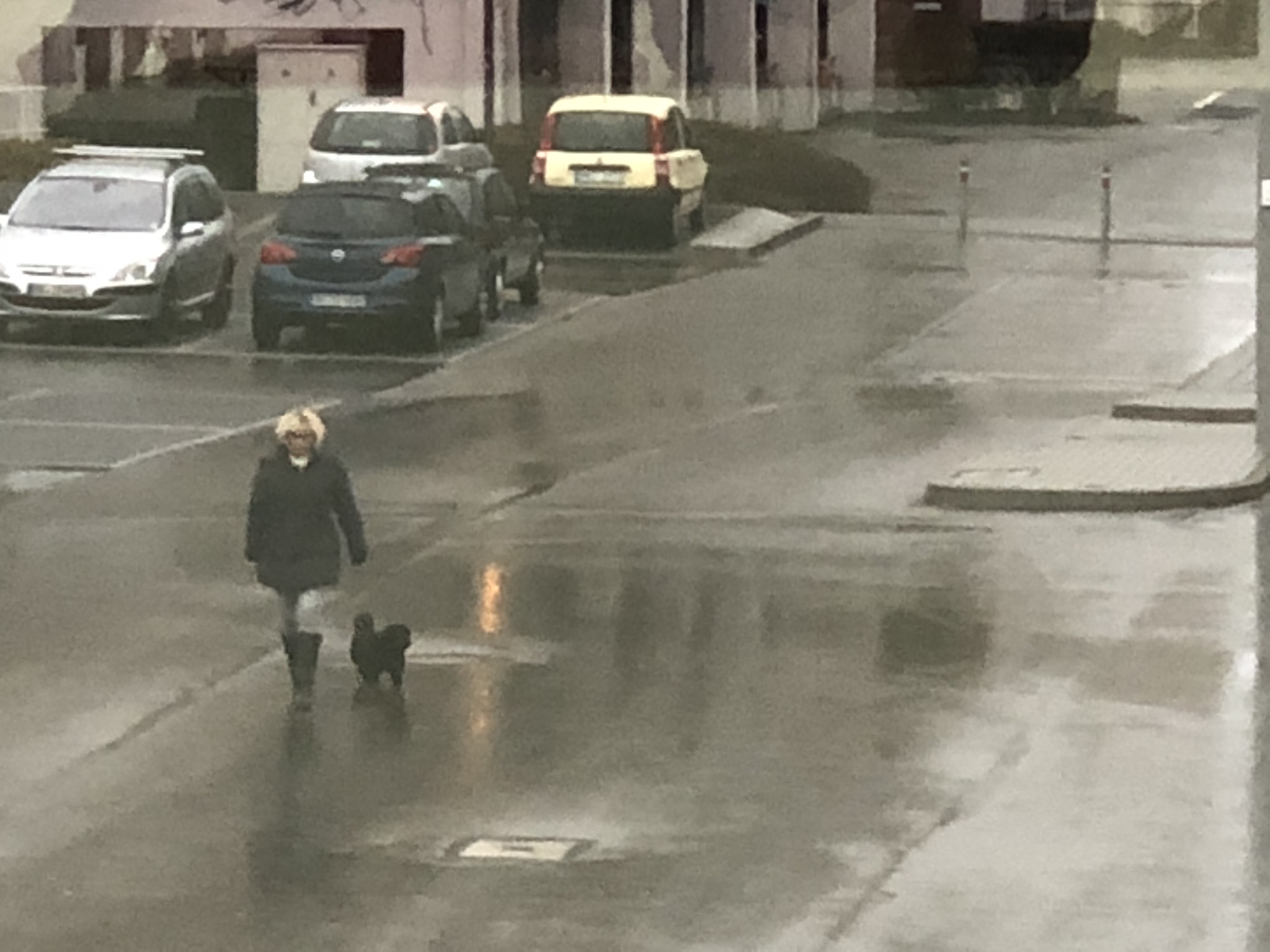 Eine Frau mit blonden Haaren und einer dunklen Jacke geht mit einem kleinen schwarzen Hund auf einer regennassen Straße. Im Hintergrund sind mehrere parkende Autos und eine graue Asphaltoberfläche zu sehen. Der Himmel ist bewölkt, und es scheint, als ob es gerade geregnet hat. Die Umgebung wirkt urban und ruhig.