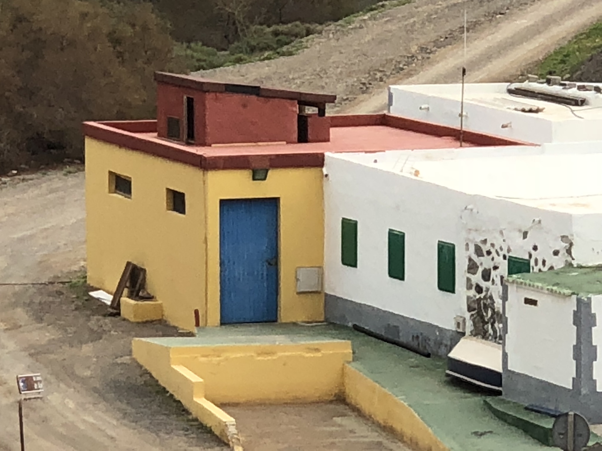 Das Bild zeigt ein gelbes Gebäude mit einem blauen Eingang und roten Dächern. An der Fassade sind mehrere kleine Fenster sichtbar. Neben dem Gebäude befindet sich eine Treppe, die zu einem kleinen Plattformbereich führt. Hinter dem gelben Gebäude steht eine weiße Struktur mit grünen Fenstern und einer grauen Basis, die an ein anderes Gebäude anschließt. Im Vordergrund ist ein unbefestigter Weg zu sehen, der auf einen gravelierten Bereich führt.