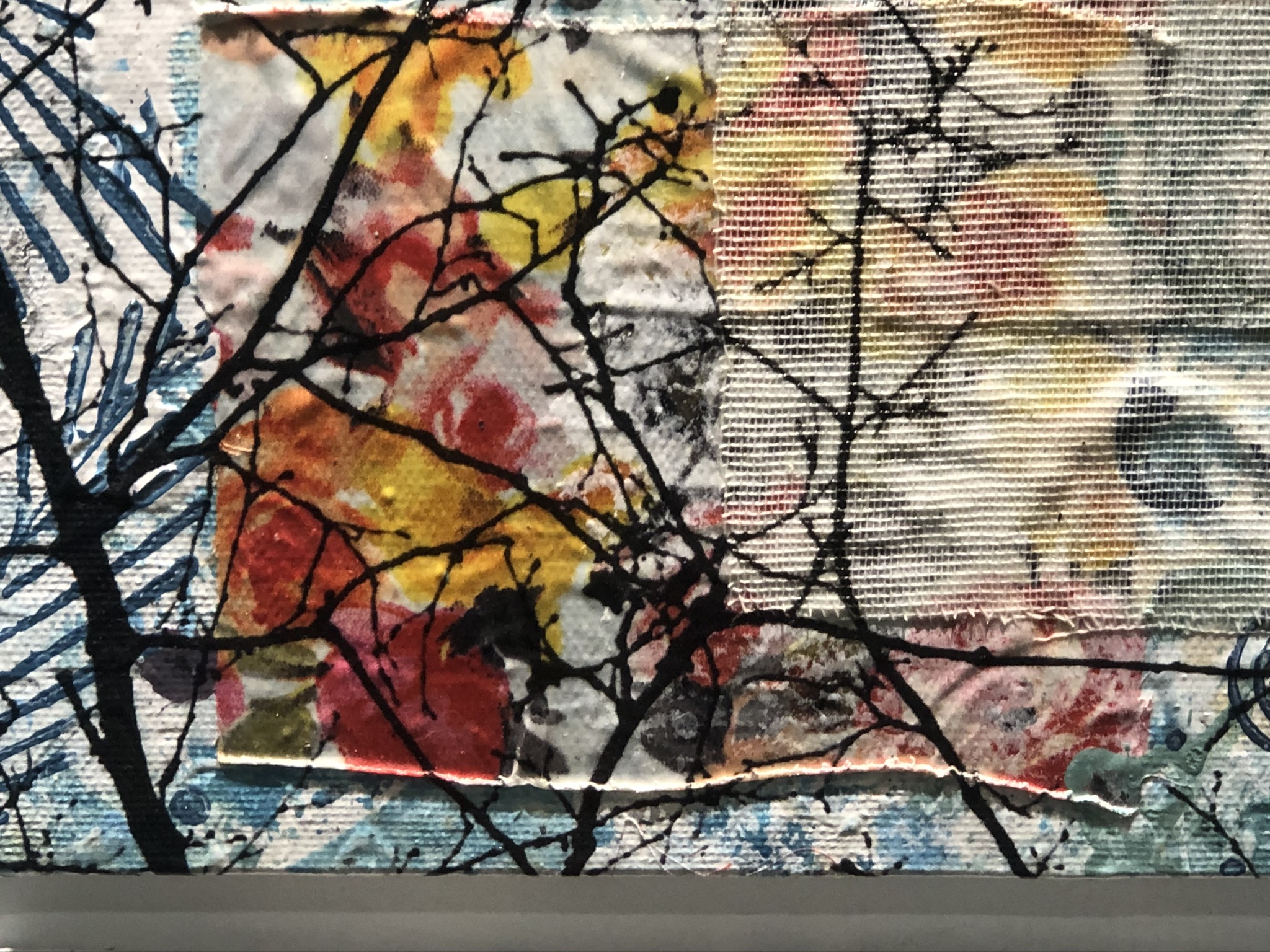 Das Bild zeigt eine künstlerische Komposition mit organischen Formen und Farben. Im Vordergrund sind schwarze, verzweigte Linien sichtbar, die an Baumäste erinnern. Diese Linien überlagern Bereiche voller Farben in lebhaften Tönen wie Rot, Gelb und einer Mischung aus sanften Pastellfarben. Die Textur des Hintergrunds wirkt unregelmäßig und strukturiert, wobei verschiedene Farbüberlagerungen und -spritze sichtbar sind. Die Komposition vermittelt eine harmonische Verbindung zwischen natürlichen Elementen und abstrakten Farbtönen.