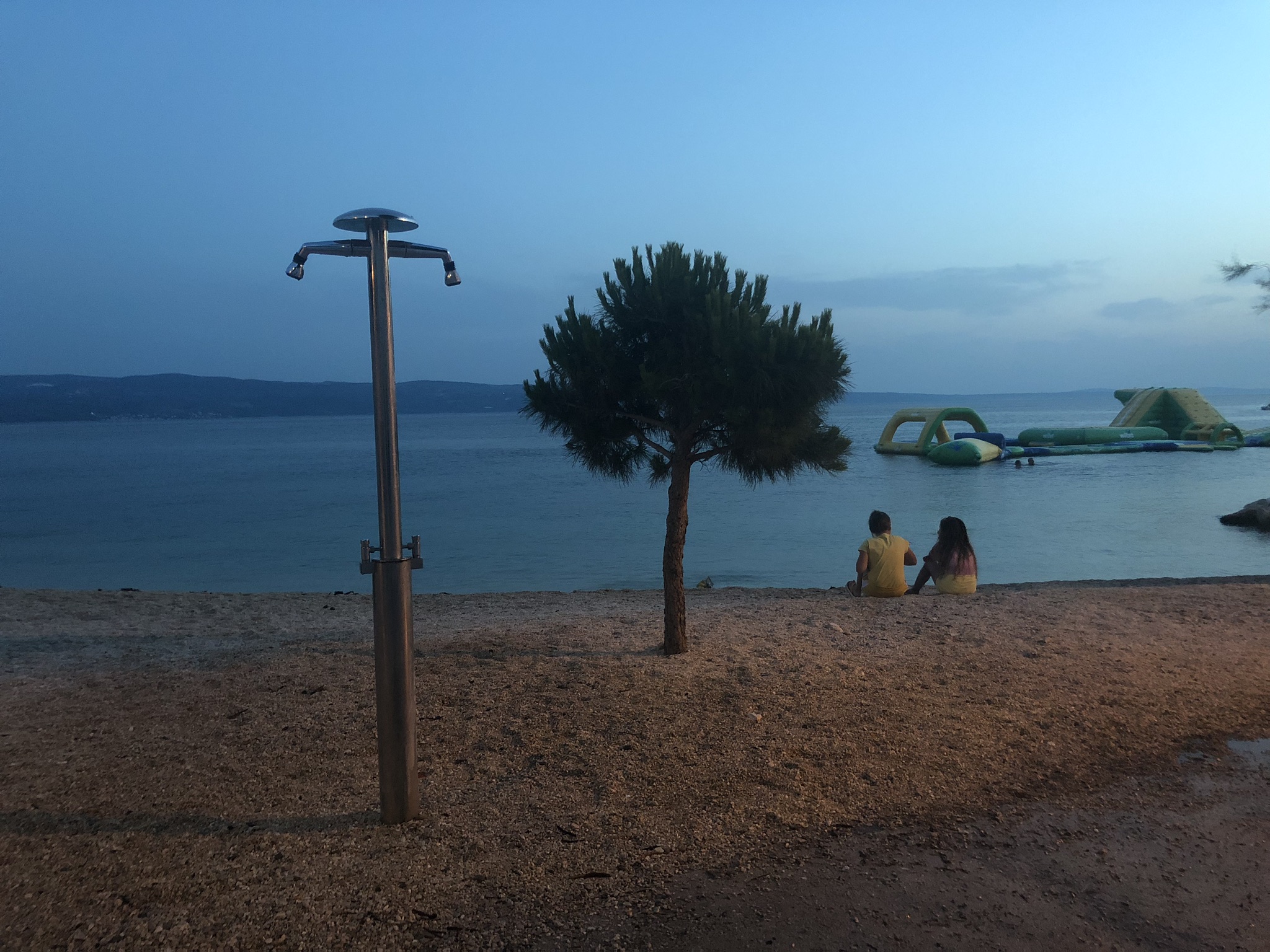 Das Bild zeigt eine ruhige Strandlandschaft bei Dämmerung. Im Vordergrund steht eine Edelstahl-Dusche, die zum Abspülen nach dem Schwimmen einlädt. Links neben der Dusche steht ein kleiner Baum. Im Hintergrund erstreckt sich das ruhige Wasser, in dem ein aufblasbares Wasserspielzeug sichtbar ist. Zwei Personen sitzen im Sand am Ufer und genießen den Ausblick auf das Wasser und den Freizeitspaß. Die Atmosphäre ist entspannend und einladend, ideal für einen Tag am Strand.