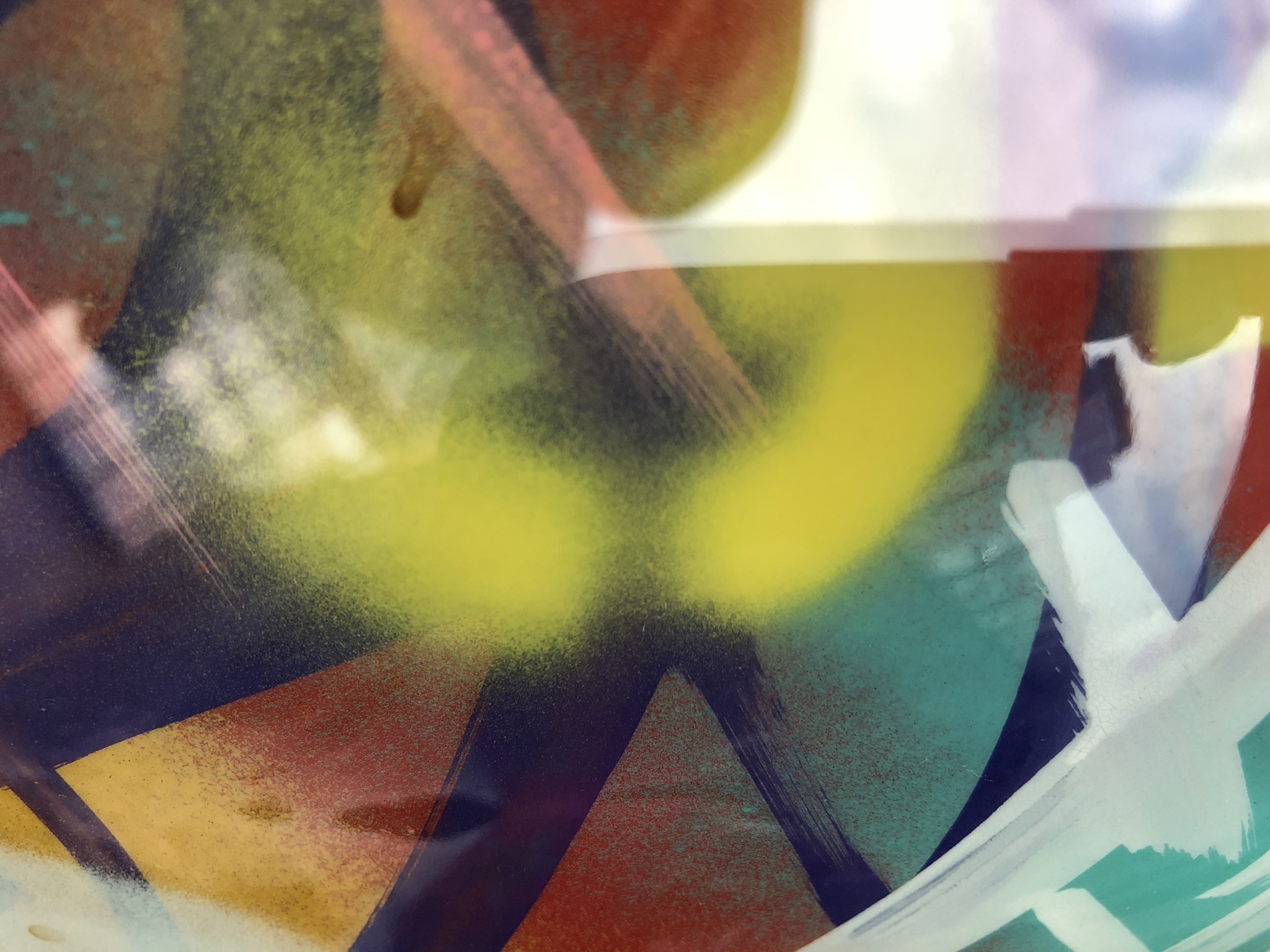 Das Bild zeigt eine abstrakte Komposition aus verschiedenen Farben und Formen. Leuchtende Gelbtöne sind vor einem Hintergrund aus Blau, Grün und Rot angeordnet. Unschärfen und Texturen schaffen eine dynamische Wirkung. Strichzeichnungen und Farbverläufe ergänzen die visuelle Tiefe. Die Komposition vermittelt ein Gefühl von Bewegung und Kreativität. Ideal für moderne Kunstliebhaber und als dekoratives Element in jedem Raum.