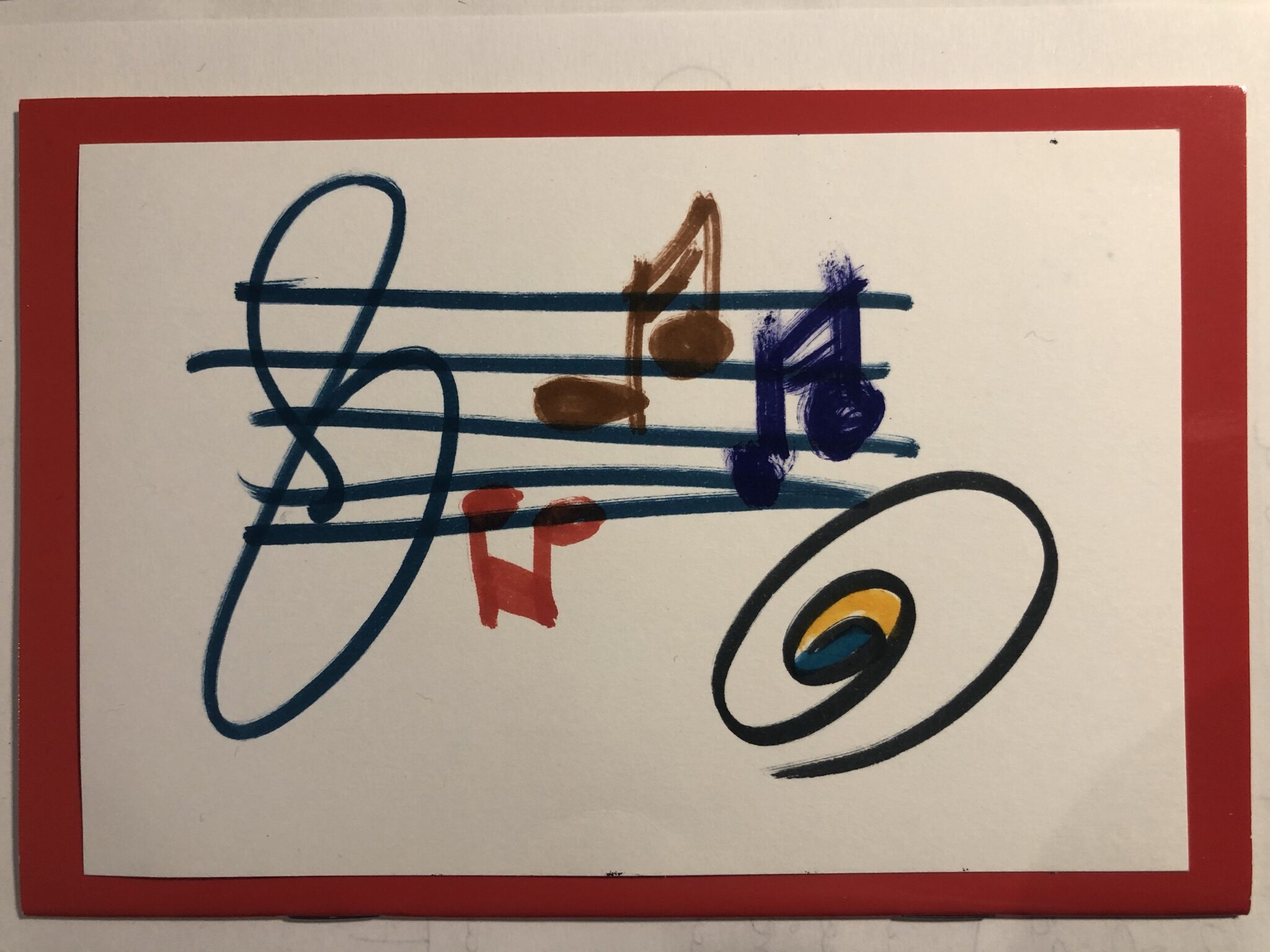 Das Bild zeigt eine kreative Zeichnung auf einem weißen Hintergrund, umrandet von einem roten Rahmen. Auf einer sechszeiligen Notenlinie sind verschiedene Noten in unterschiedlichen Farben angebracht: eine braune Viertelnote, eine blaue Halb- oder Viertelnote und eine rote Note. Über die Notenlinien zieht sich eine geschwungene, blaue Linie, die eine stilisierte Darstellung einer musikalischen Note oder eines Symbols darstellt. Am rechten Rand befindet sich ein schwungvoll gezeichnetes Element in Schwarz mit einem gelben und blauen Akzent. Die gesamte Komposition vermittelt ein fröhliches und musikalisches Gefühl.