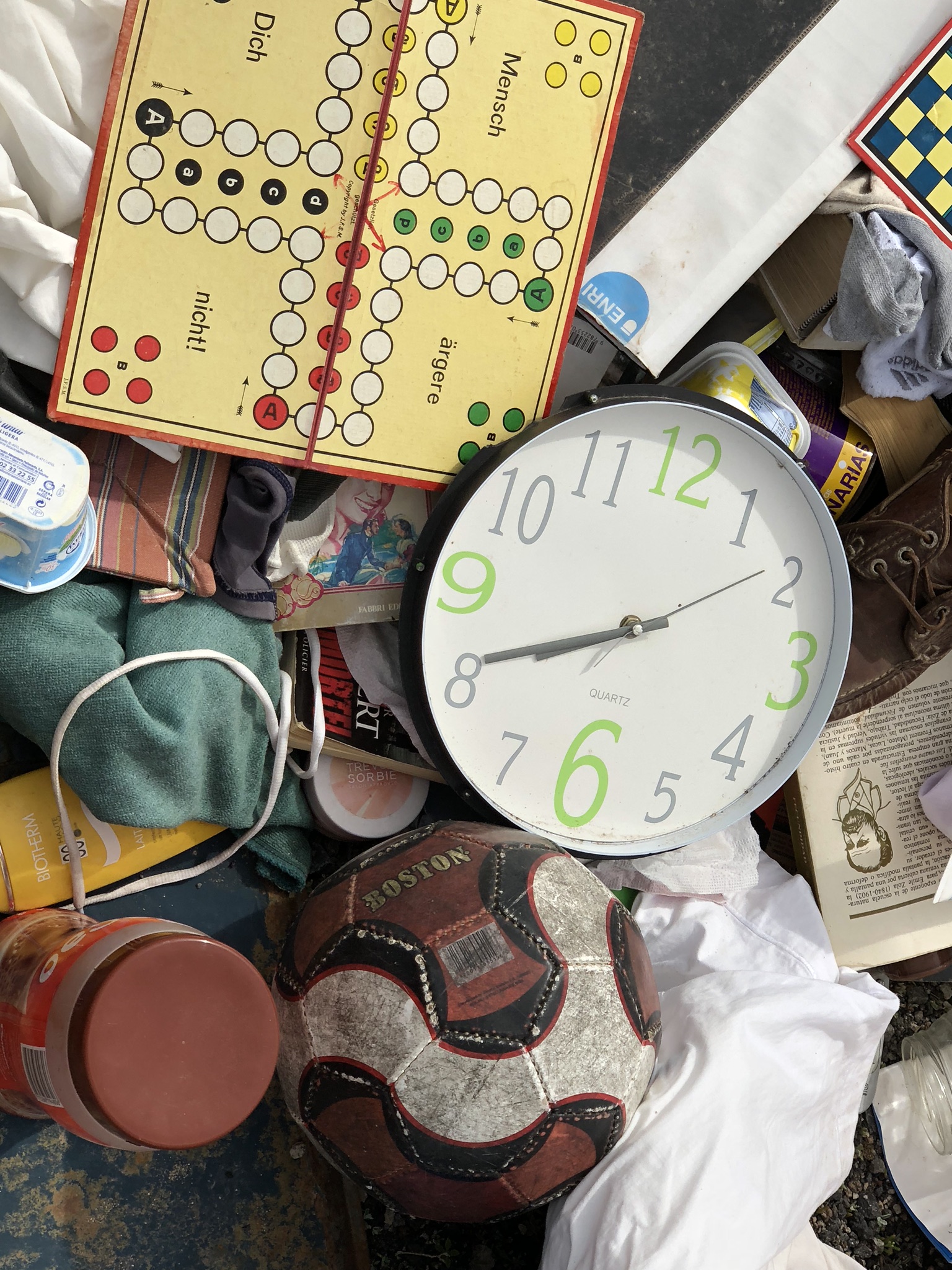 Auf dem Bild sind verschiedene Gegenstände zu sehen. In der Mitte liegt ein runder Wanduh mit einer weißen Ziffernplatte und grünen Ziffern. Daneben befindet sich ein Fußball mit den Aufschriften “BOSTON” und einem schwarz-weißen Muster. Ein Brettspiel mit dem Titel „Mensch ärgere Dich nicht“ liegt ebenfalls auf dem Boden. Es sind mehrere Verpackungen, Dosen und Flaschen sichtbar, darunter eine rote Flasche mit einem braunen Deckel. Außerdem sind einige Kleidungsstücke und ein weiteres Brettspiel, das ein Schachbrett zeigt, in der Umgebung angeordnet. Der Untergrund ist unruhig und es sind mehrere Alltagsgegenstände verstreut.