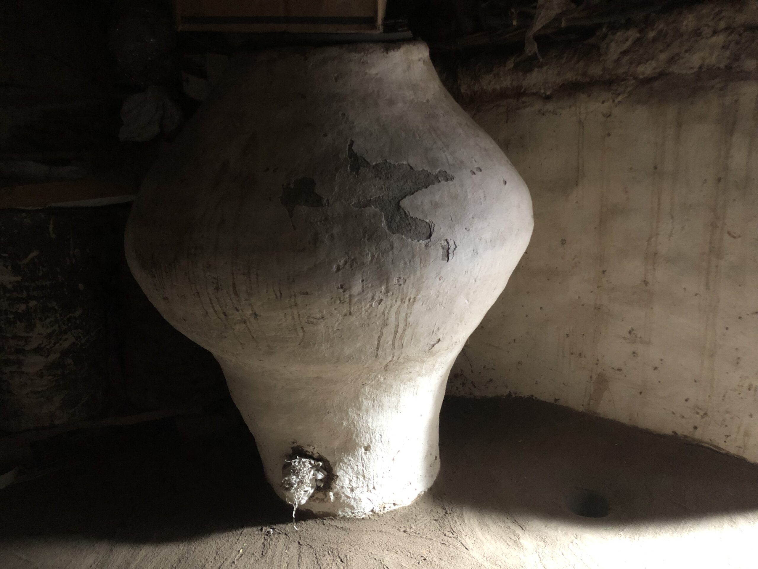 In gedämpftem Licht erhebt sich dieses beeindruckende Gefäß aus Lehm oder Ton wie ein stiller Zeitzeuge. Seine bauchige Form, die matte Oberfläche und die sichtbaren Spuren von Nutzung und Alter erzählen Geschichten von Handwerk, Wasser und Alltag vergangener Zeiten. Der kleine Wasserhahn am unteren Rand wirkt wie ein Detail aus einer anderen Epoche – funktional, roh und ehrlich.in hütte