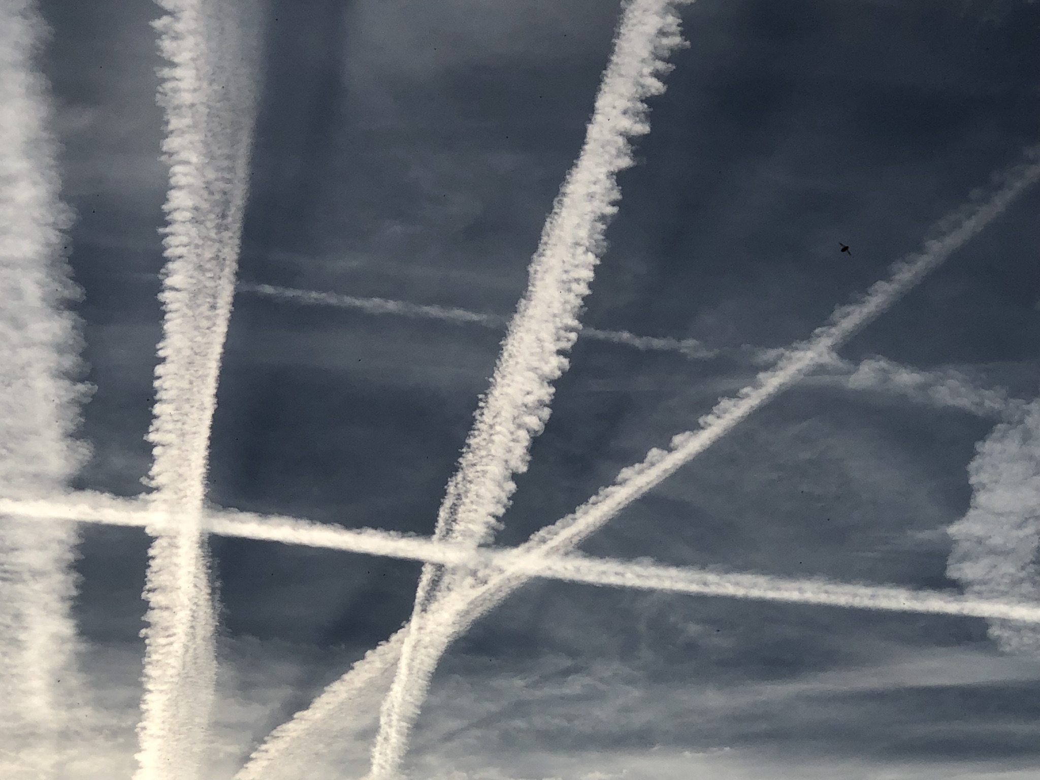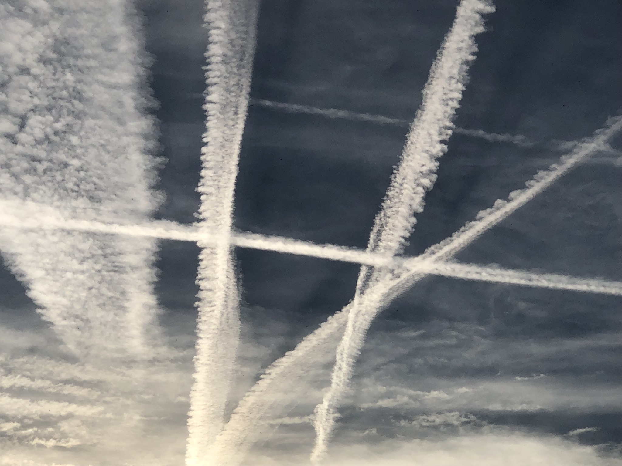 Das Bild zeigt einen Himmel, der von verschiedenen Kondensstreifen durchzogen ist. Diese Streifen verlaufen in unterschiedlichen Richtungen und kreuzen sich, wodurch ein auffälliges Muster entsteht. Der Hintergrund ist von grauen Wolken geprägt, während die untergehende Sonne am unteren Bildrand eine sanfte Helligkeit erzeugt. Die Wolken erscheinen in verschiedenen Texturen und Grautönen, während die Kondensstreifen leuchtend weiß abheben.