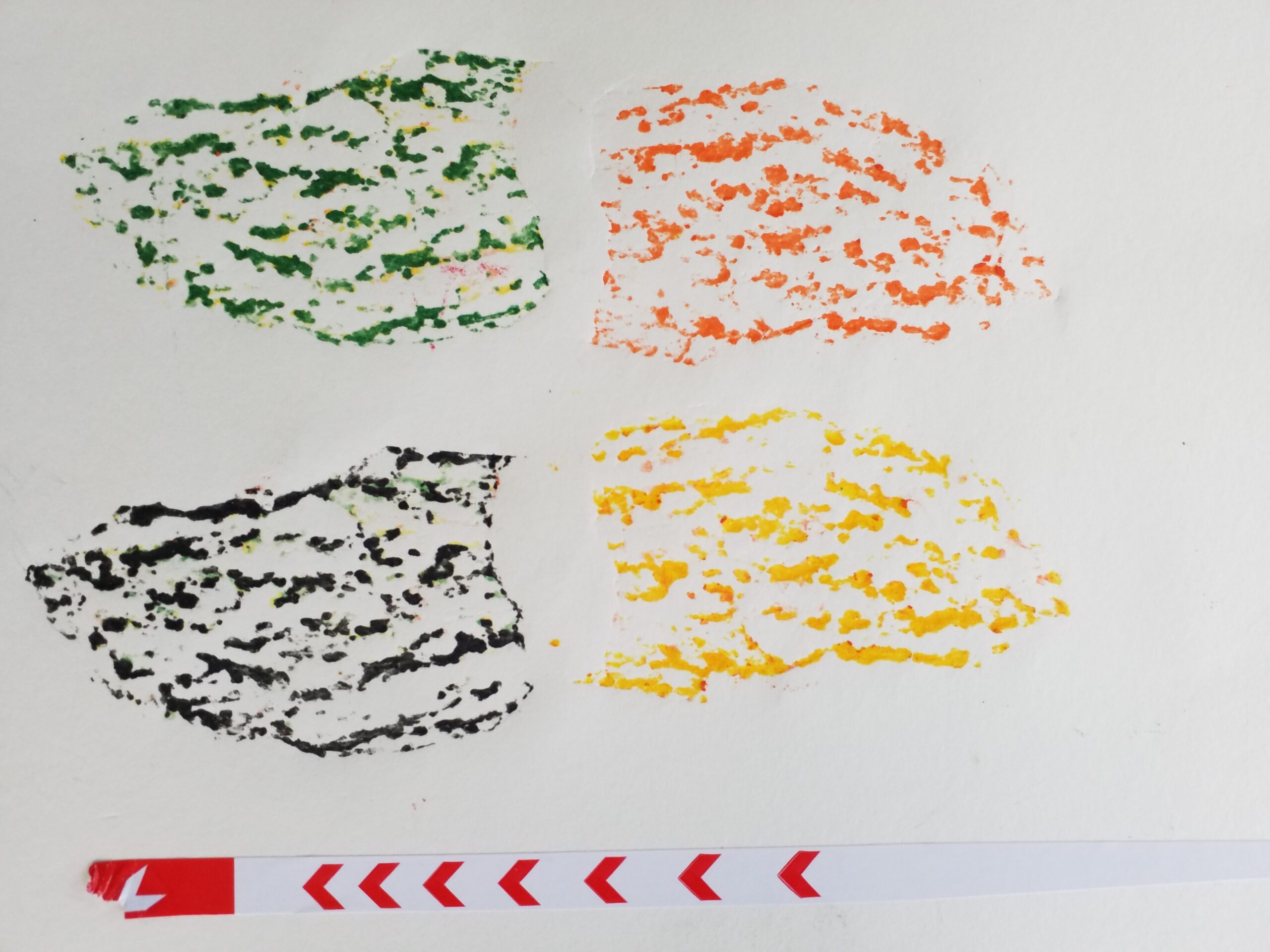 Das Bild zeigt vier farbige Abdrücke auf einem weißen Blatt Papier. Oben links befindet sich ein grüner Abdruck mit einer unregelmäßigen, strukturierten Oberfläche. Rechts daneben ist ein orangefarbener Abdruck, der ebenfalls unregelmäßig erscheint. Unten links ist ein schwarzer Abdruck, der durch einen hohen Kontrast geprägt ist. Rechts unten liegt ein gelber Abdruck, der leuchtend und unregelmäßig gestaltet ist. Unterhalb der Abdrücke verläuft ein weißes Band mit roten Pfeilen, das eine Art Markierung darstellt.