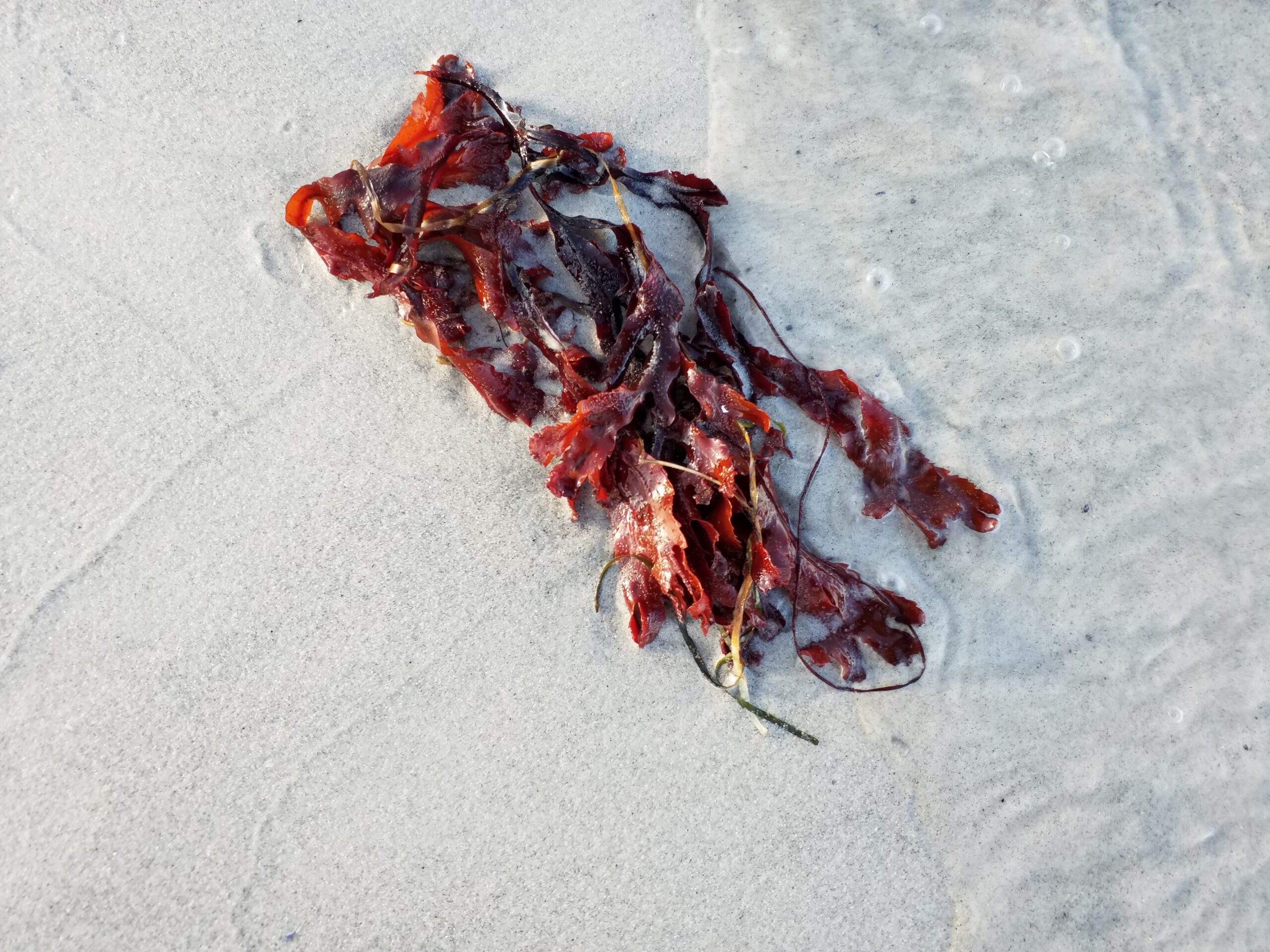 Auf dem Bild ist eine Ansammlung von rotem Seetang zu sehen, die auf einem sandigen Strand liegt. Der Sand ist hell und feinkörnig, und es gibt einige wassernahe Blasen, die darauf hindeuten, dass das Wasser in der Nähe der Seetangansammlung ist. Der Seetang hat eine glatte Oberfläche und eine geschwungene Form, die in verschiedene Richtungen verläuft.