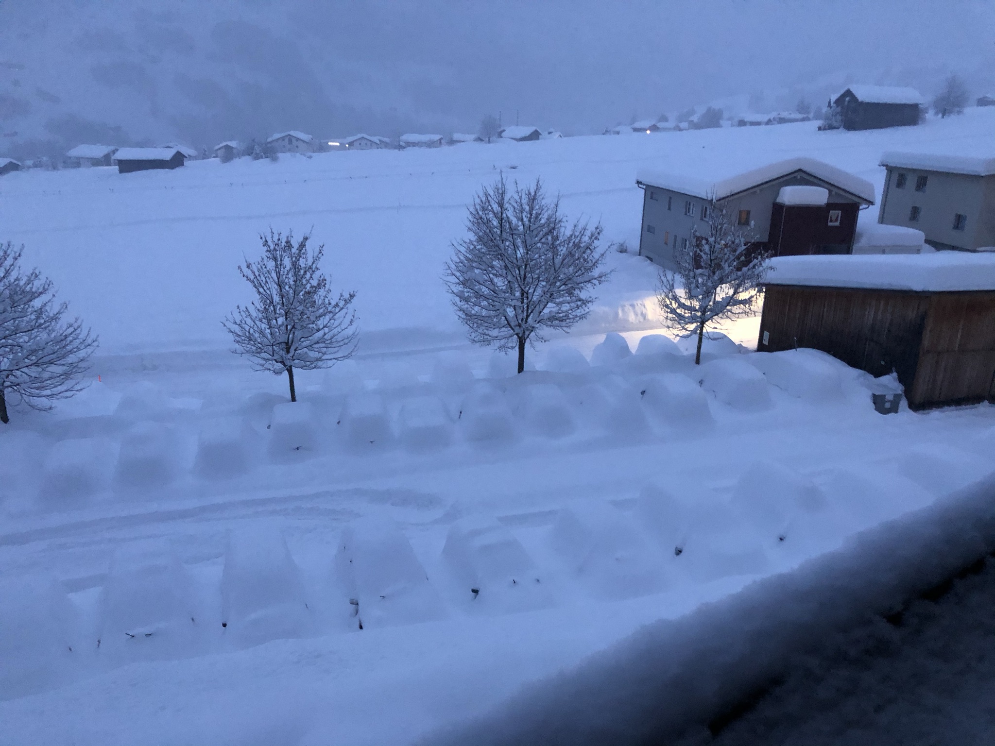Das Bild zeigt eine winterliche Landschaft, die von einer dicken Schneedecke bedeckt ist. Im Vordergrund sind einige schneebedeckte Objekte zu erkennen, die wie Autos oder kleine Hütten wirken, die teilweise im Schnee verschwunden sind. Auf der linken Seite stehen zwei Bäume, die ebenfalls mit Schnee bedeckt sind. Im Hintergrund sind mehrere Bauwerke zu sehen, die sich in einer sanften Hügellandschaft befinden, die von Schnee geziert ist. Die gesamte Szene hat eine vernebelte, winterliche Atmosphäre, die auf die Kälte und die späte Tageszeit hinweist.
