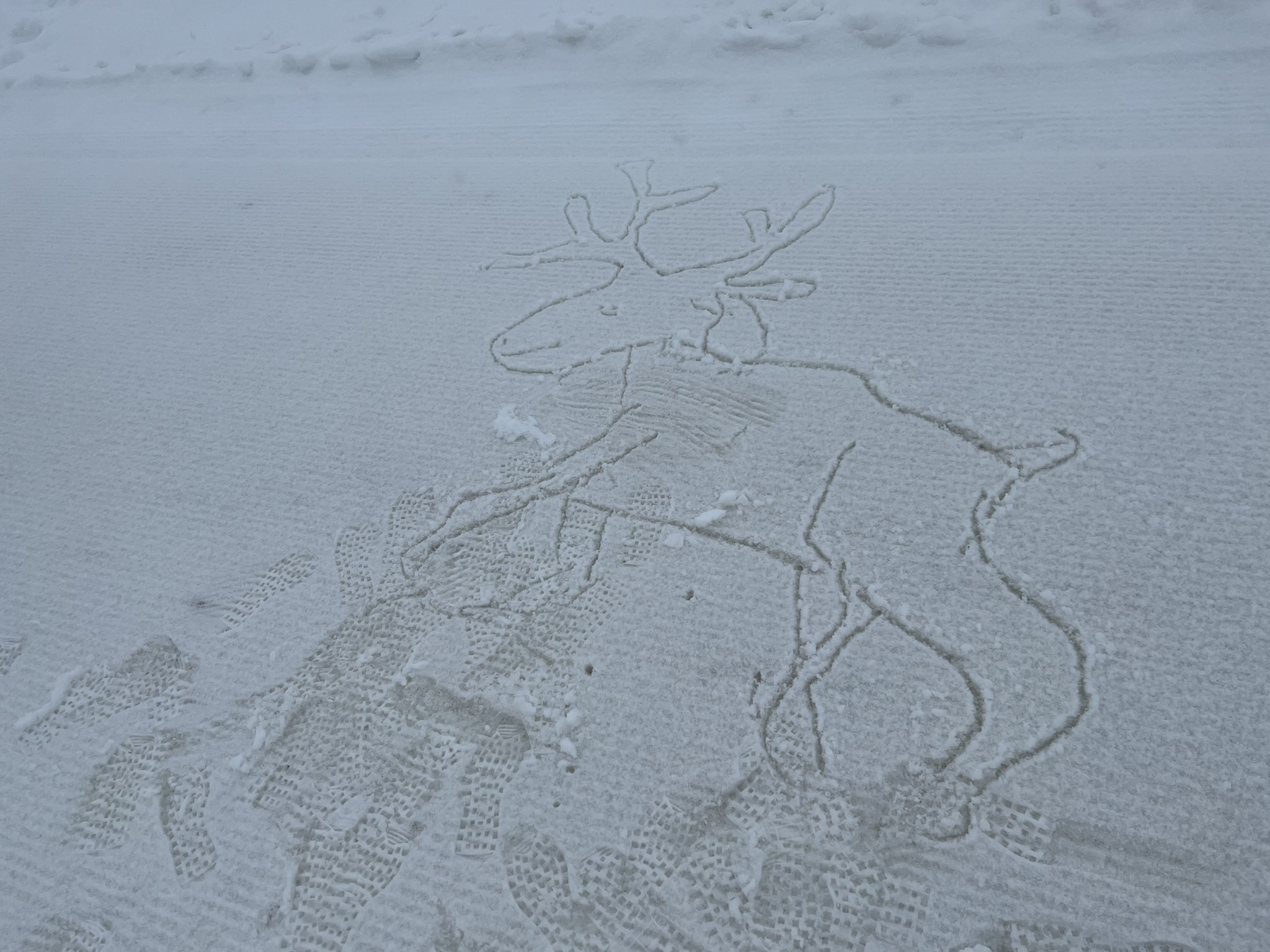 Auf dem Bild ist eine schneebedeckte Fläche zu sehen, auf der ein Motive eines Elches kunstvoll in den Schnee gezogen wurde. Die Konturen des Elches sind klar erkennbar, mit einem ausgeprägten Kopf und Geweih sowie den Beinen, die im Schnee sichtbar sind. Im Hintergrund befinden sich Fußabdrücke, die auf Aktivitäten im Schnee hinweisen. Die Gesamtstimmung vermittelt eine winterliche und kreative Atmosphäre.