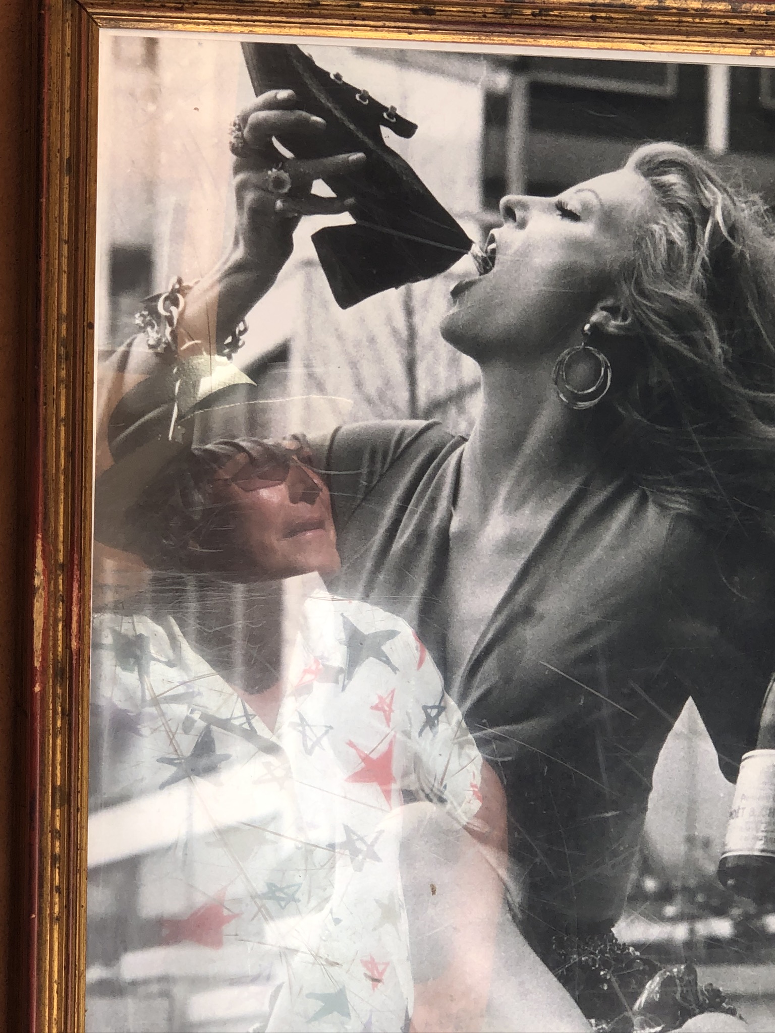Das Bild zeigt eine schwarz-weiß Fotografien von einer Frau, die einen Schuh in der Hand hält und ihn an ihren Mund bringt, als ob sie ihn gerade anbeißt. Ihre Gesichtszüge sind leidenschaftlich und extravagant, mit betonten Lippen und auffälligen Ohrringen. Sie trägt ein elegantes Oberteil und hat volles, lockiges Haar. Im Hintergrund ist eine verschwommene Silhouette eines Mannes zu sehen, der ein gemustertes Hemd mit Sternen trägt. Das Bild hat einen nostalgischen Charme und wirkt durch den Rahmen leicht vergilbt.