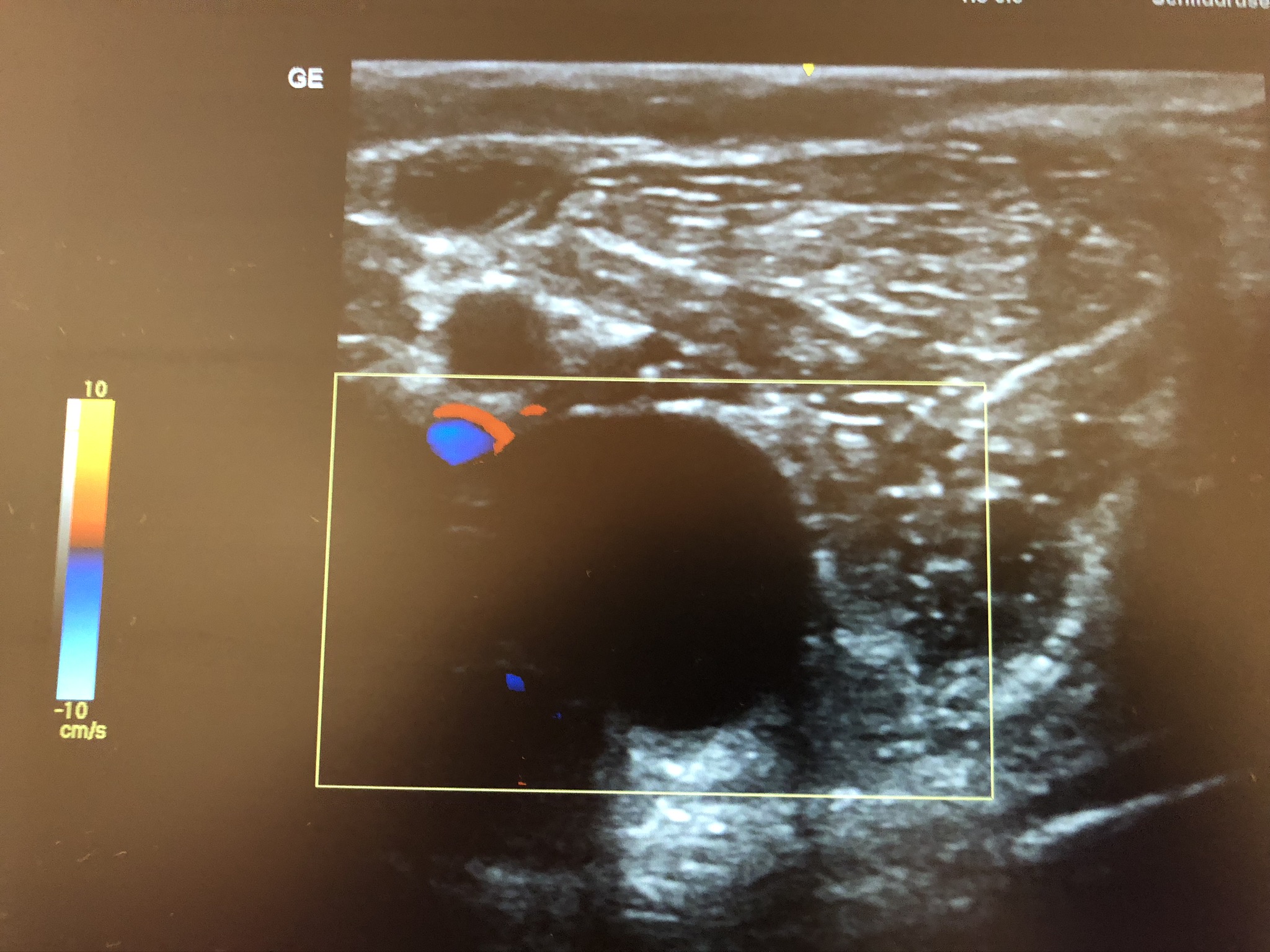 Das Bild zeigt eine Ultraschalluntersuchung mit einer schwarz-weiß Darstellung des Gewebes. In der Mitte ist ein farblich hervorgehobenes Objekt sichtbar, das Rot- und Blautöne aufweist, was auf Blutfluss hinweist. Die Darstellung ist umrahmt von einem gelben Rechteck. Auf der linken Seite ist eine Farbskala zu sehen, die Geschwindigkeiten von -10 bis +10 cm/s anzeigt, wobei Blau für negative Werte und Rot für positive Werte steht. Oben ist das Logo “GE” zu erkennen.