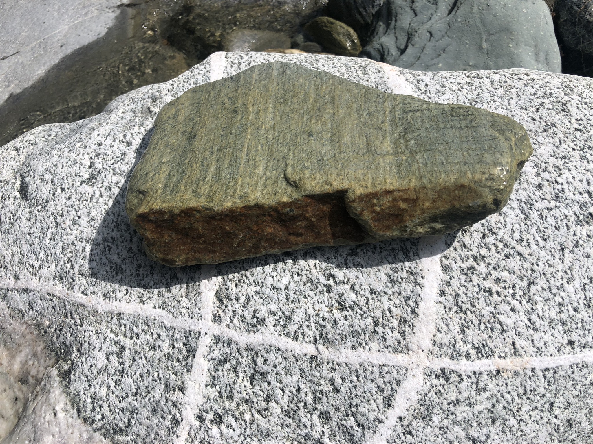 Ein grünlicher Stein liegt auf einer grauen, strukturierten Oberfläche. Die Oberfläche des grauen Steins zeigt feine Linien und Muster, während der grüne Stein eine glatt-polierte, leicht glänzende Textur hat. Der Hintergrund zeigt weitere Steine in unterschiedlichen Farben und Texturen, die teilweise feucht sind und in Sonnenlicht glänzen.