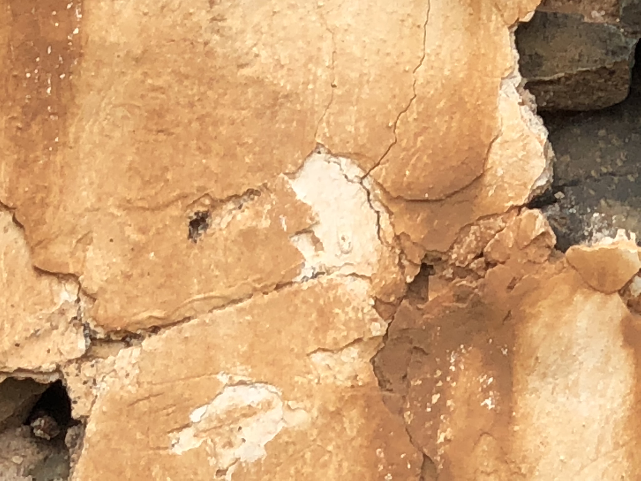 Die Produktbeschreibung zeigt eine Wandoberfläche mit einer robusten, fixer Struktur. Die Farben reichen von warmen Gelb- und Brauntönen, die verschiedenen Einschlüsse und Texturen aufweisen. Die Wand zeigt deutlich Spuren von Abplatzungen und Rissen, was auf ein gewisses Alter hindeutet. Stellenweise sind mineralische Ablagerungen sichtbar, die der Oberfläche ein einzigartiges, rustikales Aussehen verleihen. Diese Wand könnte als Dekorationselement für rustikale oder industrielle Innenräume verwendet werden.