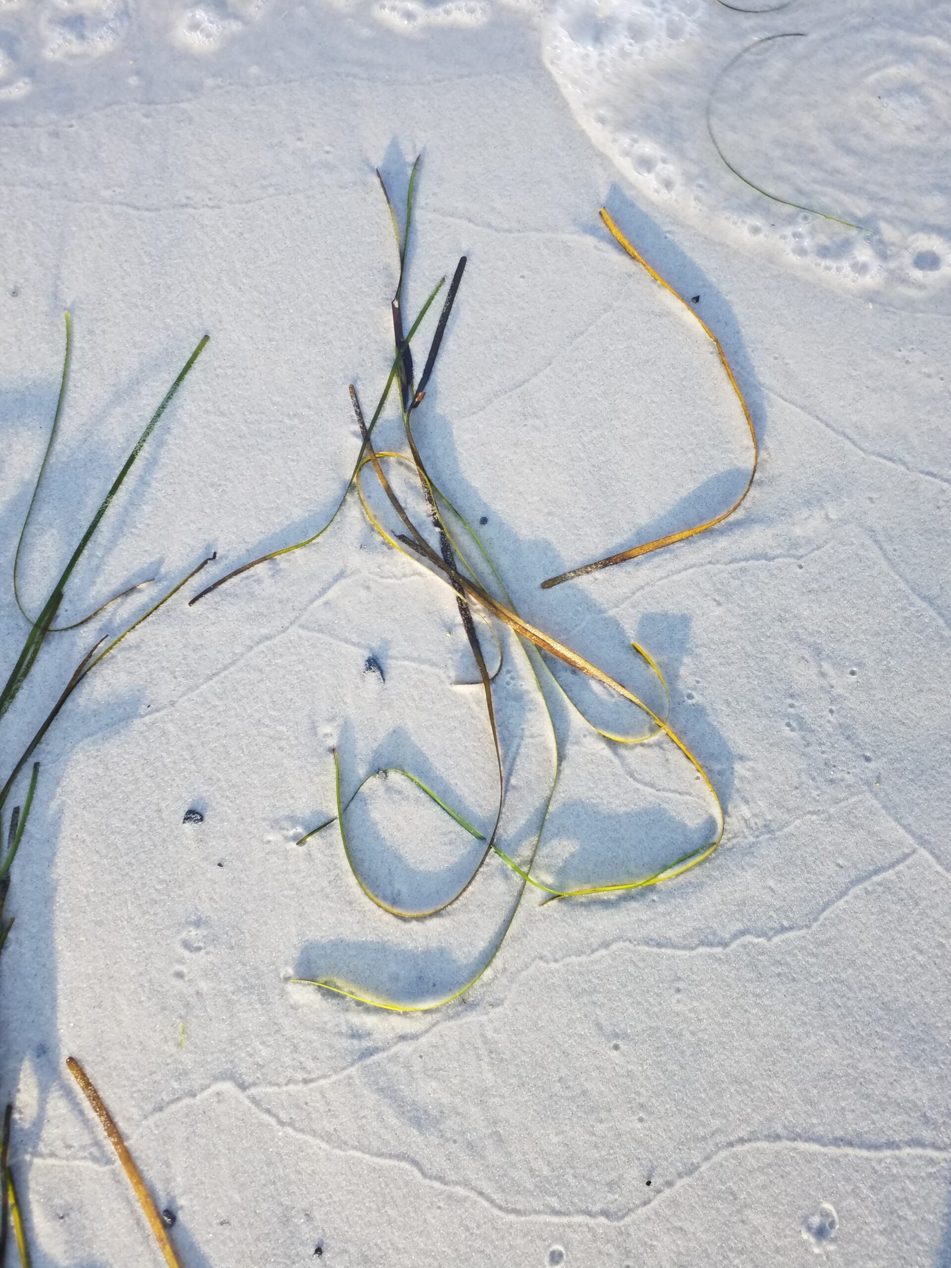 Auf dem Bild sind mehrere dünne, grüne und braune Pflanzenteile zu sehen, die auf hellem, sandigem Untergrund liegen. Im Hintergrund ist eine sanfte Welle mit weißen Schaumkronen zu erkennen. Die Oberfläche des Sands zeigt leichte Wellenmuster und kleine, dunkle Stellen. Die Pflanzenteile sind unregelmäßig angeordnet und verleihen der Szene eine natürliche, frische Note.
