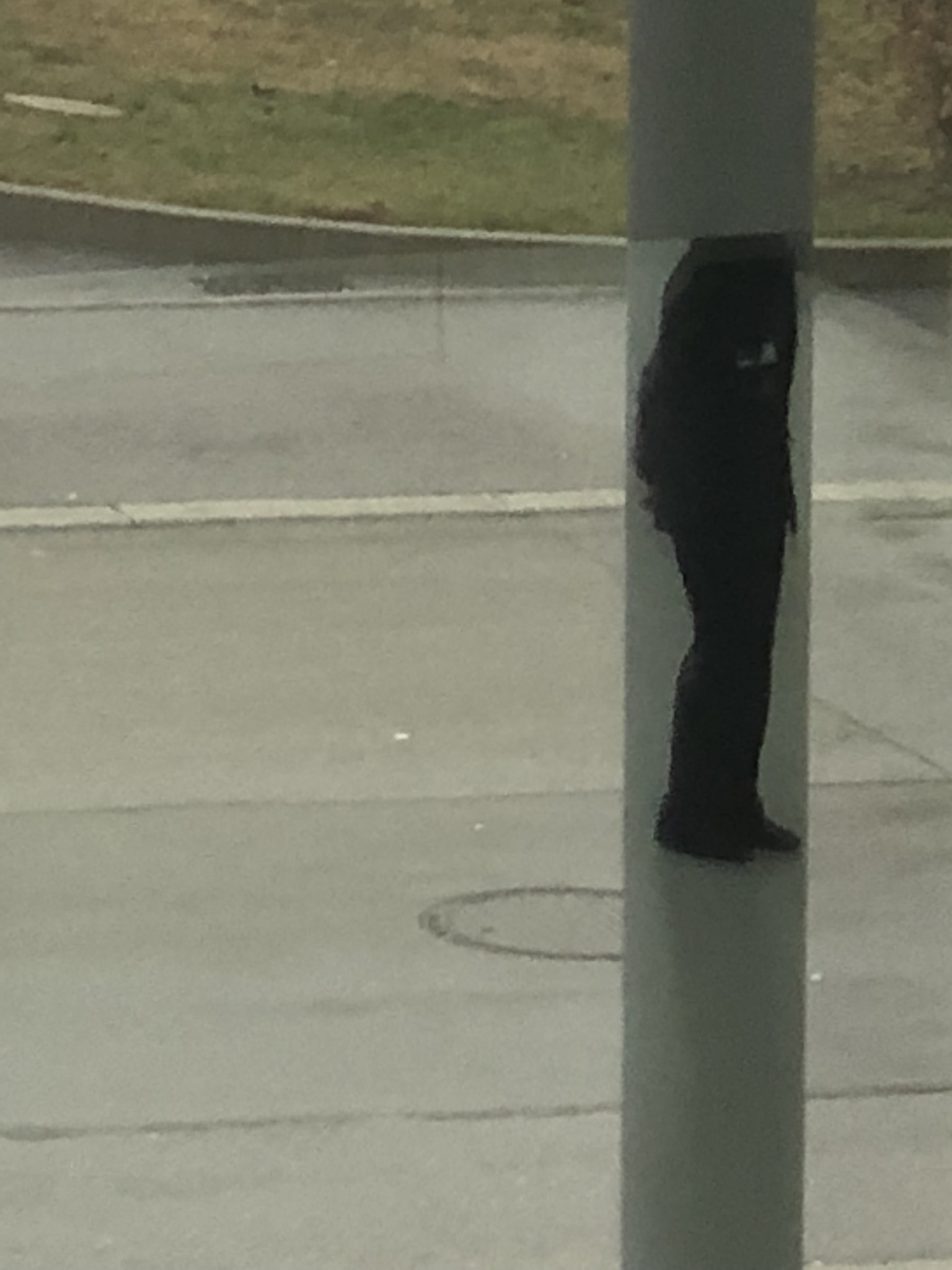 Auf dem Bild ist ein stark verwischtes oder schattenhaftes Bild eines stehenden Menschen zu sehen, der sich teilweise hinter einem grauen Strommast oder einer ähnlichen Säule verbirgt. Die Person hat dunkle Kleidung an und ist von der Hüfte abwärts sichtbar, während der obere Teil des Körpers nicht klar zu erkennen ist. Die Umgebung besteht aus einem grauen, asphaltierenden Boden mit einem grasbewachsenen Bereich im Hintergrund. Der Himmel ist bewölkt und es scheint, als ob es leicht regnet.