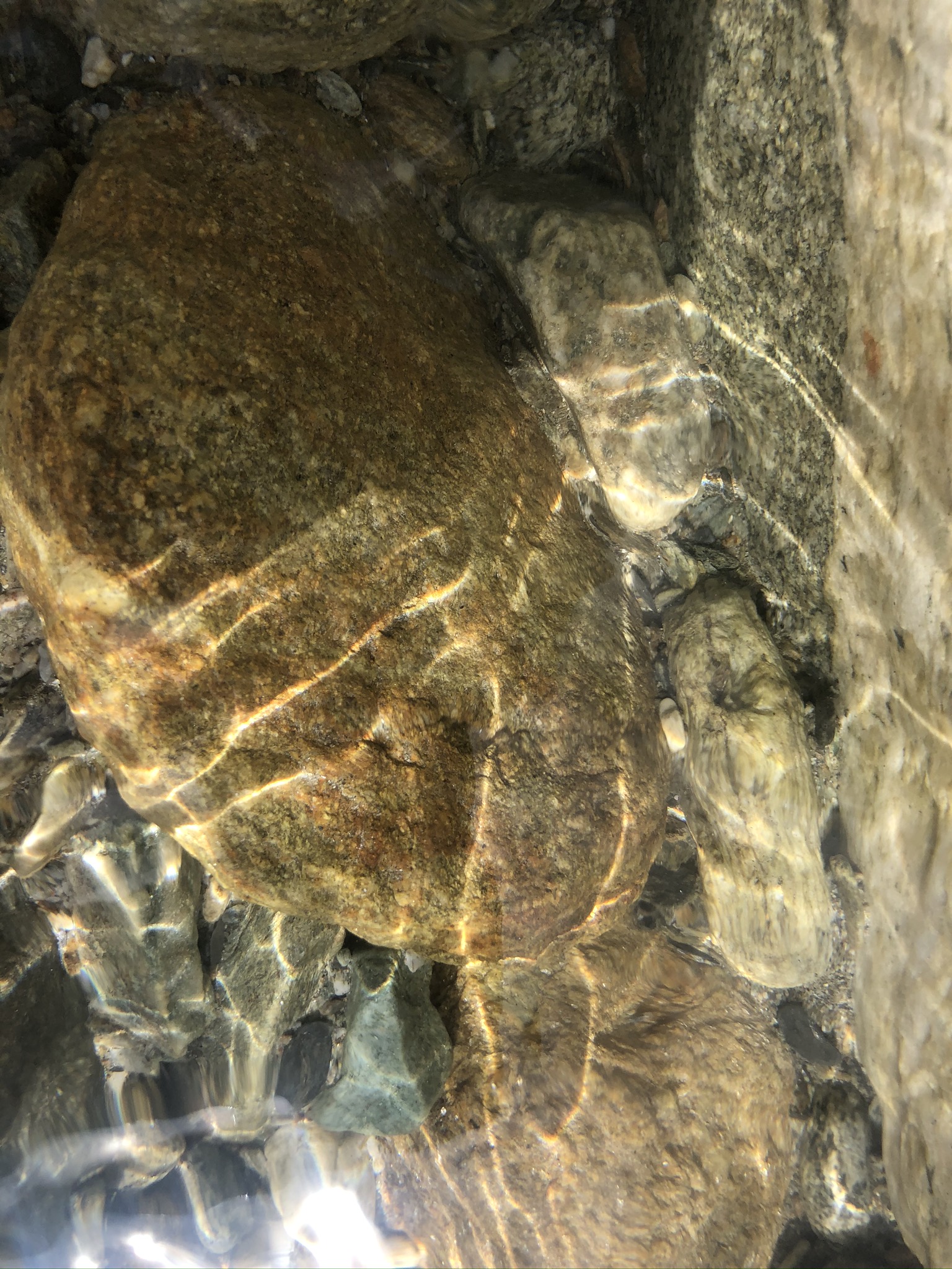 Unterwasseransicht mit verschiedenen Steinen im klaren Wasser. Die Steine haben unterschiedliche Farben, insbesondere Brauntöne und Grautöne. Lichtstrahlen reflektieren auf der Wasseroberfläche und erzeugen interessante Muster auf den Steinen. Einige Steine sind glatt, während andere eine raue Oberfläche aufweisen. Der Boden ist teilweise mit kleinen Kieselsteinen bedeckt, die in das Gesamtbild integriert sind.