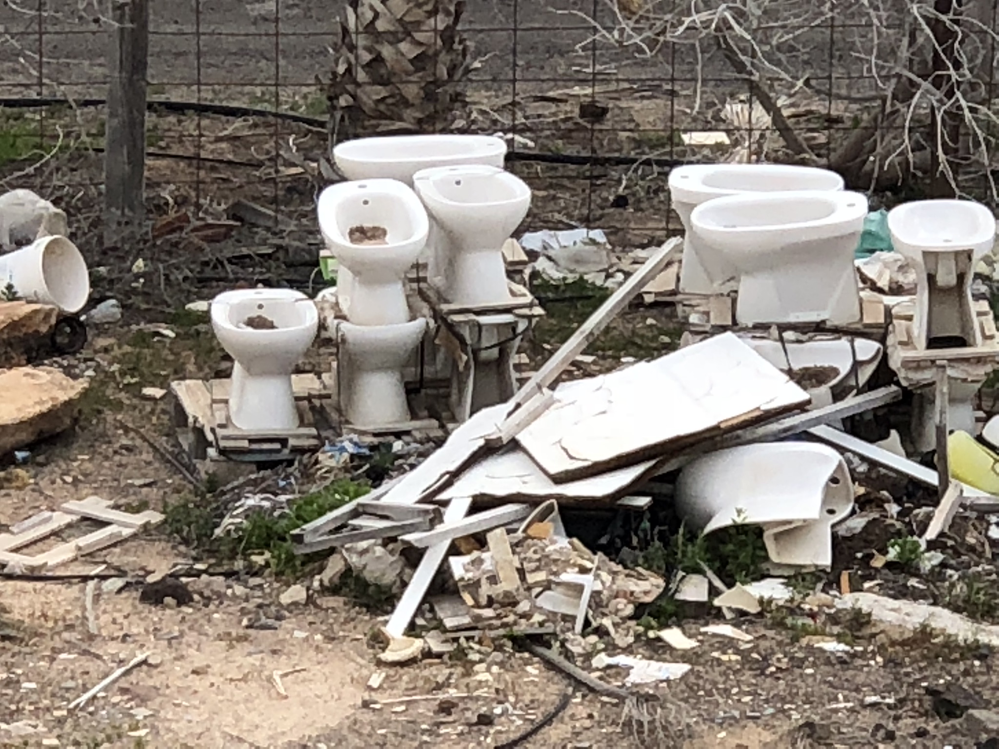 Auf dem Bild sind mehrere weiße Toiletten in unterschiedlichen Größen und Formen zu sehen, die in einem unordentlichen Umfeld stehen. Einige Toiletten sind auf Holzpaletten platziert, während andere direkt auf dem Boden liegen. Um die Toiletten herum befinden sich Baustellenmaterialien wie Holzplatten, Schutt und Pflanzen. Der gesamte Bereich wirkt verlassen und ungepflegt, mit einem Hintergrund aus Drahtzäunen und vereinzelten Bäumen oder Sträuchern.