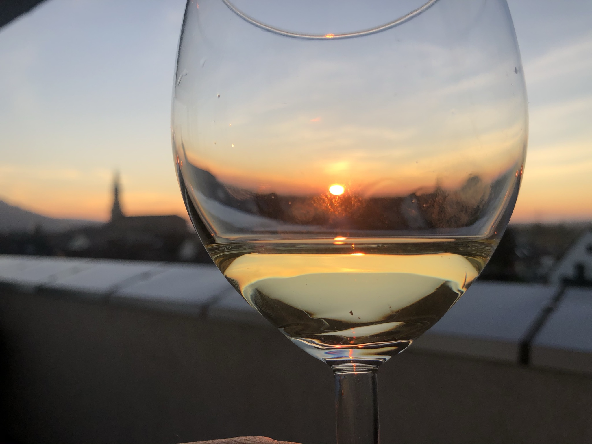 Ein elegantes Weinglas mit hellem, goldenem Wein, das vor einer malerischen Abendkulisse steht. Im Hintergrund ist ein atemberaubender Sonnenuntergang zu sehen, der den Himmel in sanften Orange- und Blautönen färbt. Die Silhouette eines Gebäudes oder einer Kirche ist verschwommen im Hintergrund zu erkennen, während die letzten Sonnenstrahlen über die Landschaft scheinen. Die glatte Oberfläche des Glases reflektiert die warmen Farben des Sonnenuntergangs und verleiht der Szene eine gemütliche Atmosphäre. Ideal für romantische Abende oder entspannende Momente auf dem Balkon.