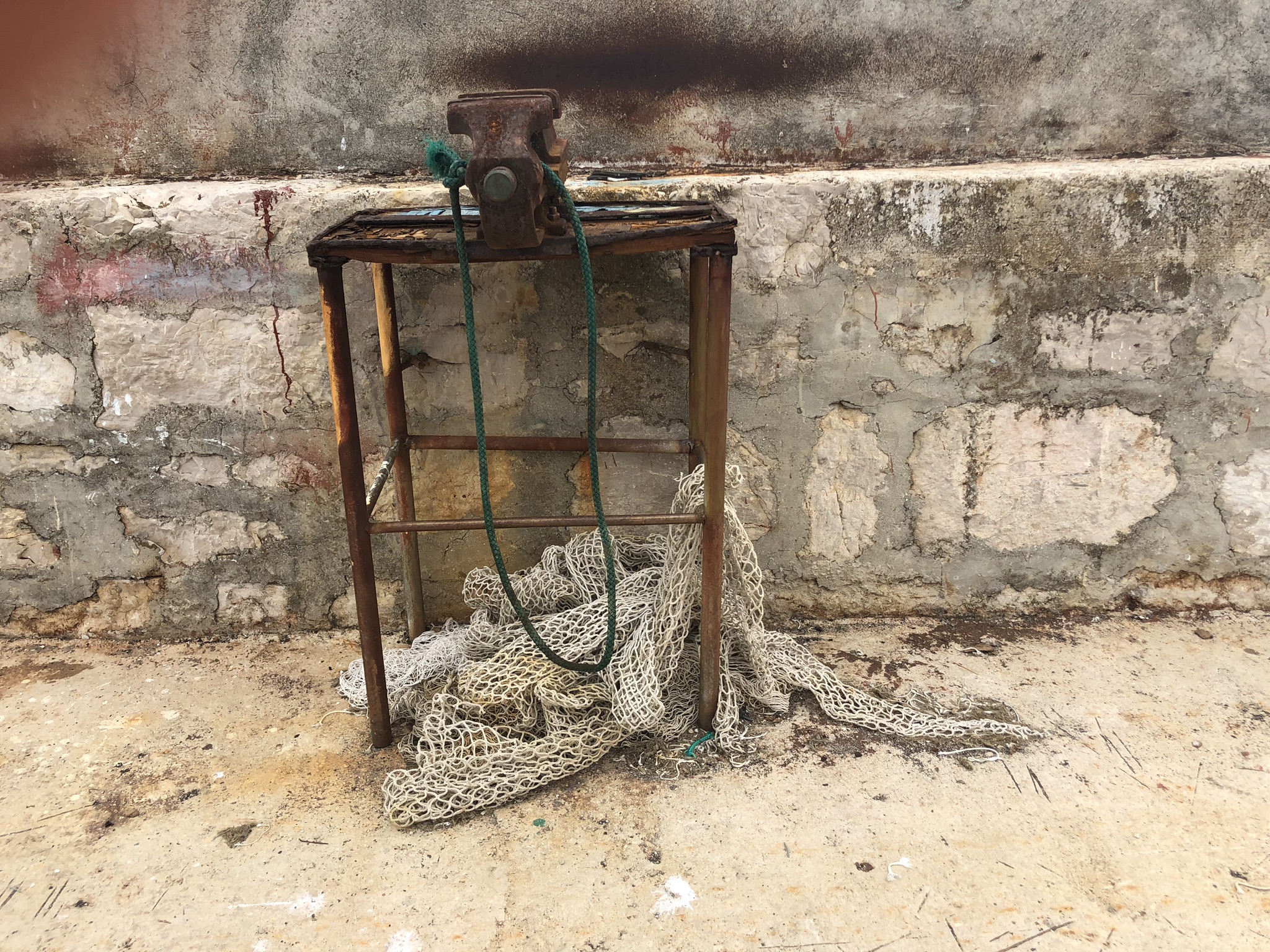 Auf dem Bild ist ein rostiger Metallrahmen zu sehen, der offenbar als Tisch oder Untergestell dient. Auf dem Rahmen ist eine Vorrichtung befestigt, die möglicherweise zum Heben oder Absenken von Lasten genutzt wird. An der unteren Seite des Rahmens liegt ein netzartiger Stoff, der an manchen Stellen zusammengewickelt ist. Der Hintergrund zeigt eine graue Steinwand mit sichtbaren Farbspuren. Der Boden ist uneben und weist einige Verunreinigungen auf.